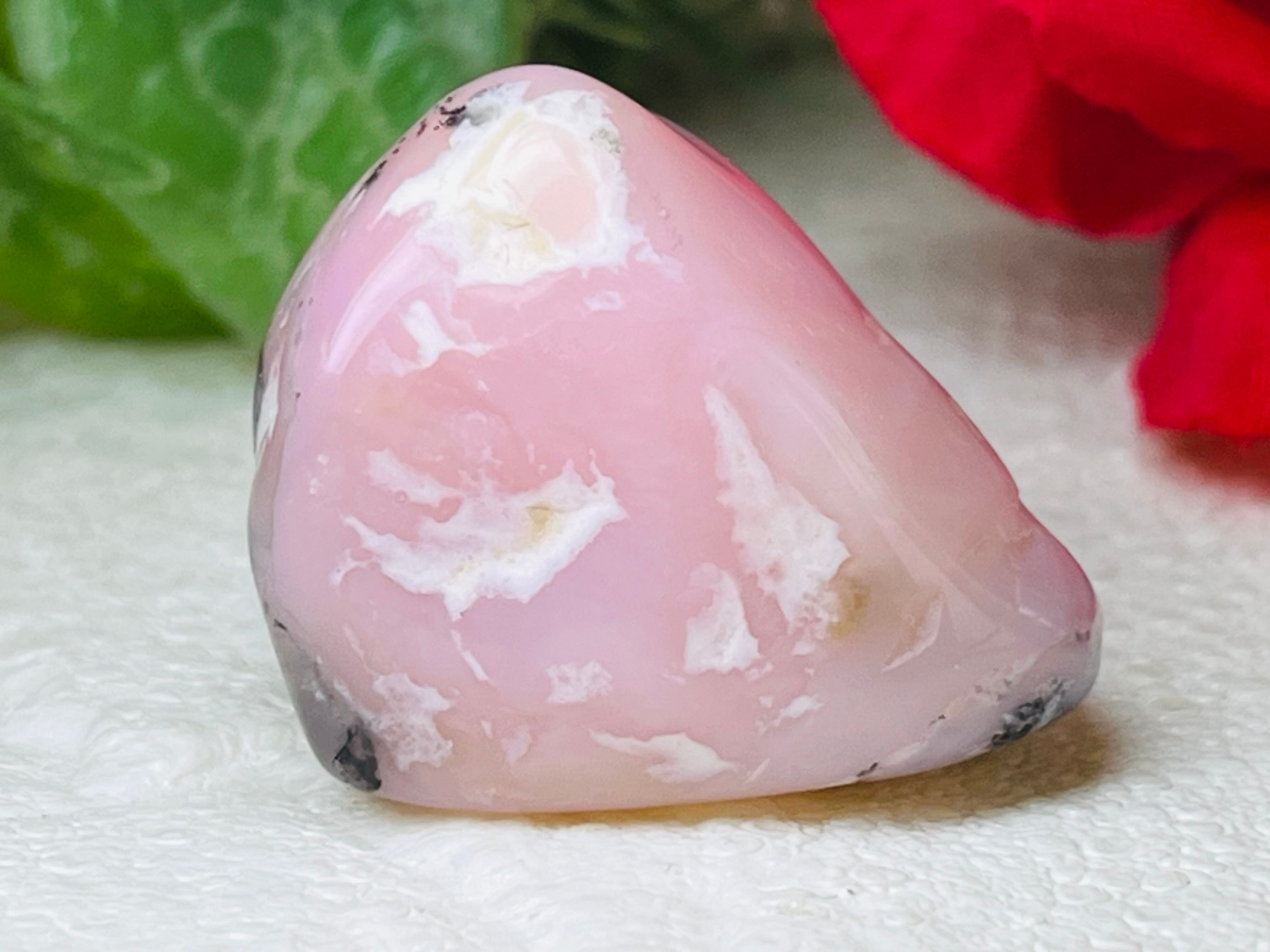 「永遠の命」が石言葉のデンドライト(忍石)が付いた、ちょっと珍しいデンドリックピンクオパールのタンブルです✨