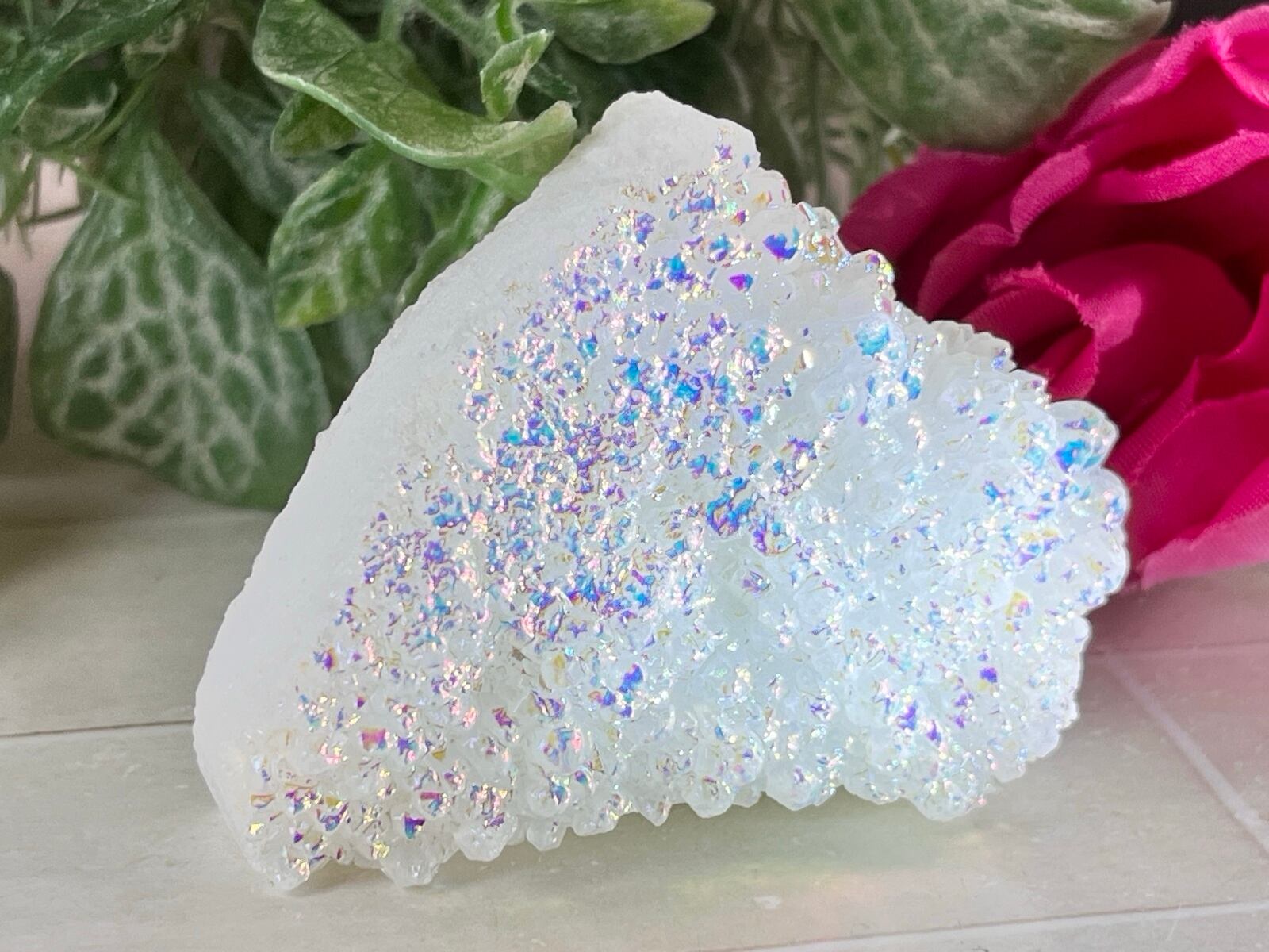 オーロラのような虹色をまとったホワイトのオーラ水晶クラスターです✨