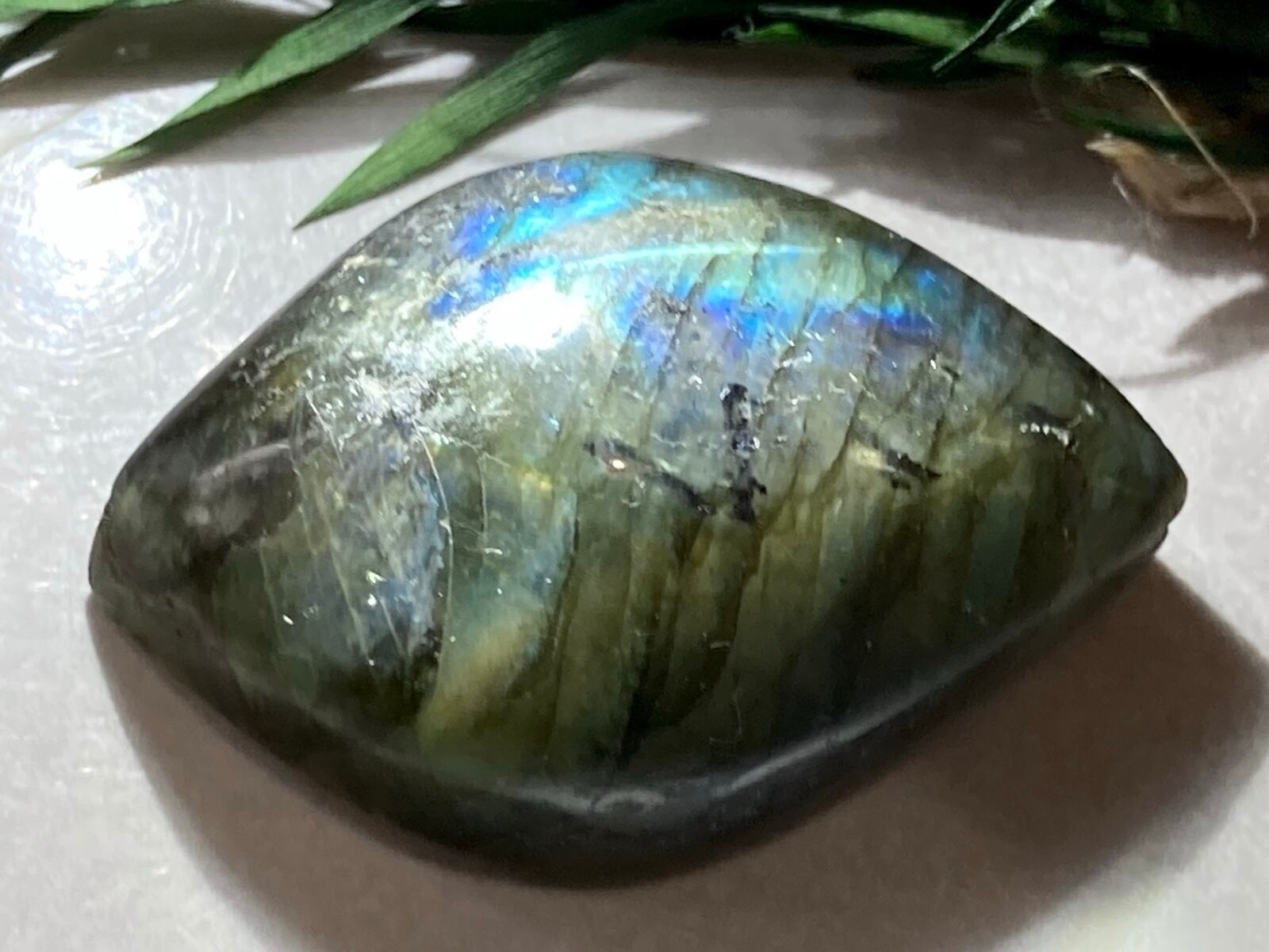 ラブラドライトは一見すると、くすんだ冴えない感じの石ですが傾けて光の当たり具合を加減すると様々な色が見られます。