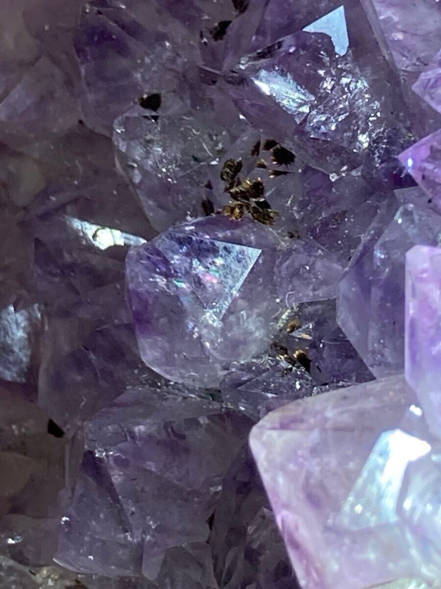 所々に金色や光輝く斑点【ゲーサイト】が入っていて透明度も高く価値の高いアメジスト原石となります!