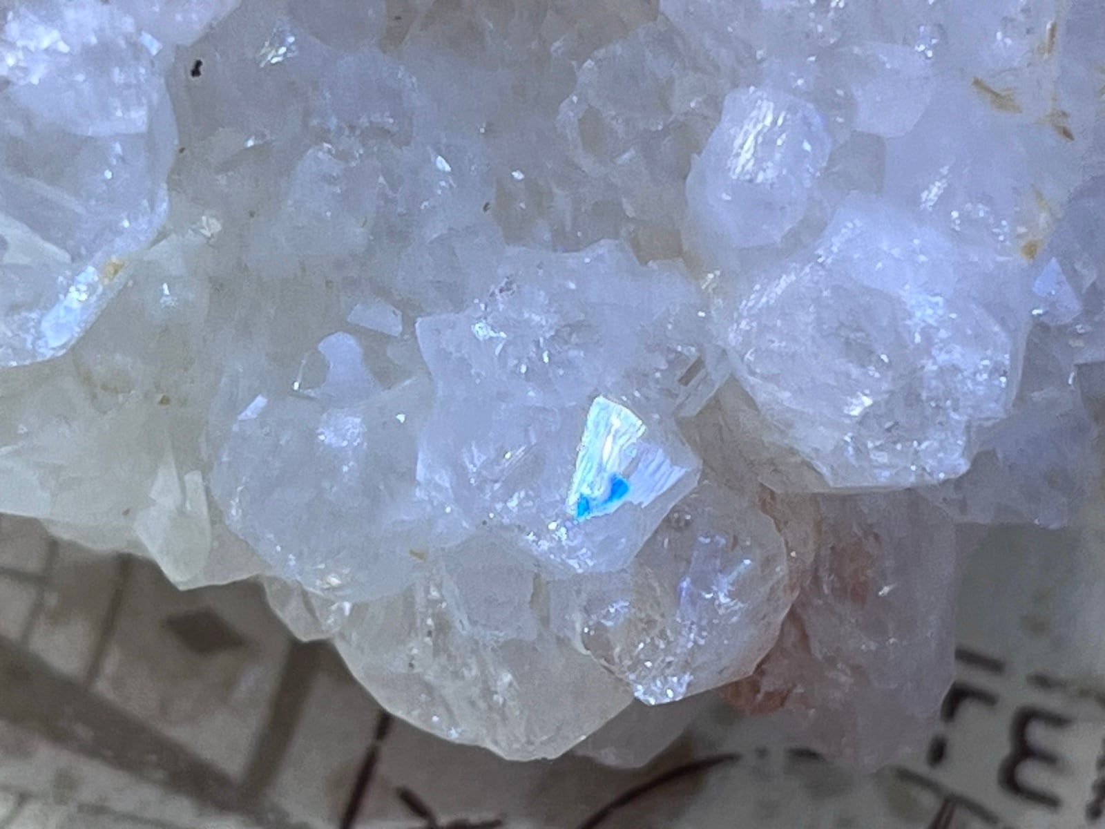 ライトなど強い光を当てると、蒼〜緑色に反射します。