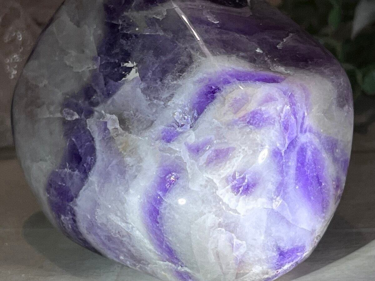 シェブロンアメジストは、アメジストとミルキー状の水晶が混ざり合い層状の模様が山型に見えることから、山を意味する「シェブロン」と呼ばれます。