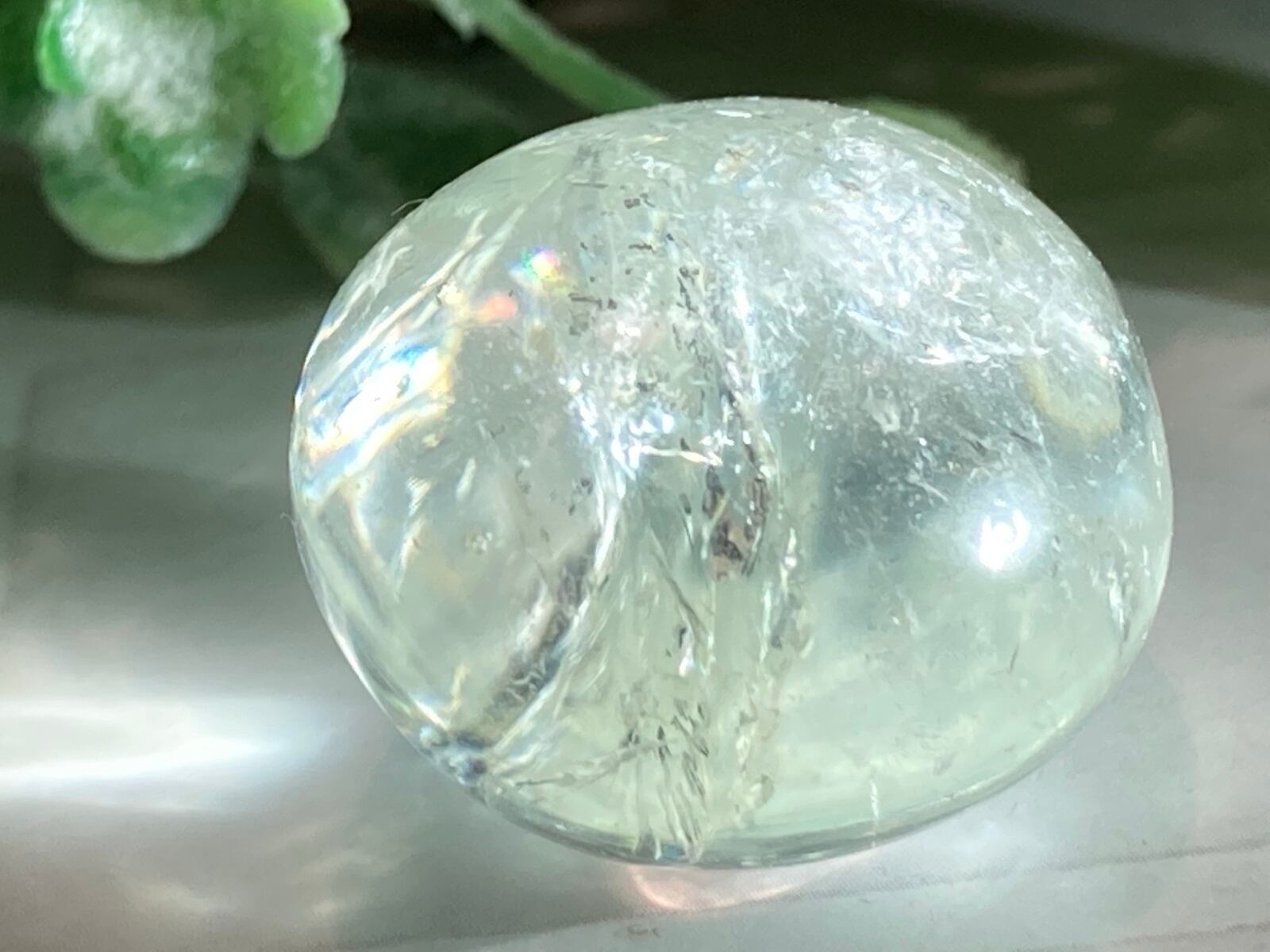 透明感がありまるでゼリーのように明るめのグリーンが特徴のグリーンアメジスト(プラシオライト)のタンブル です✨