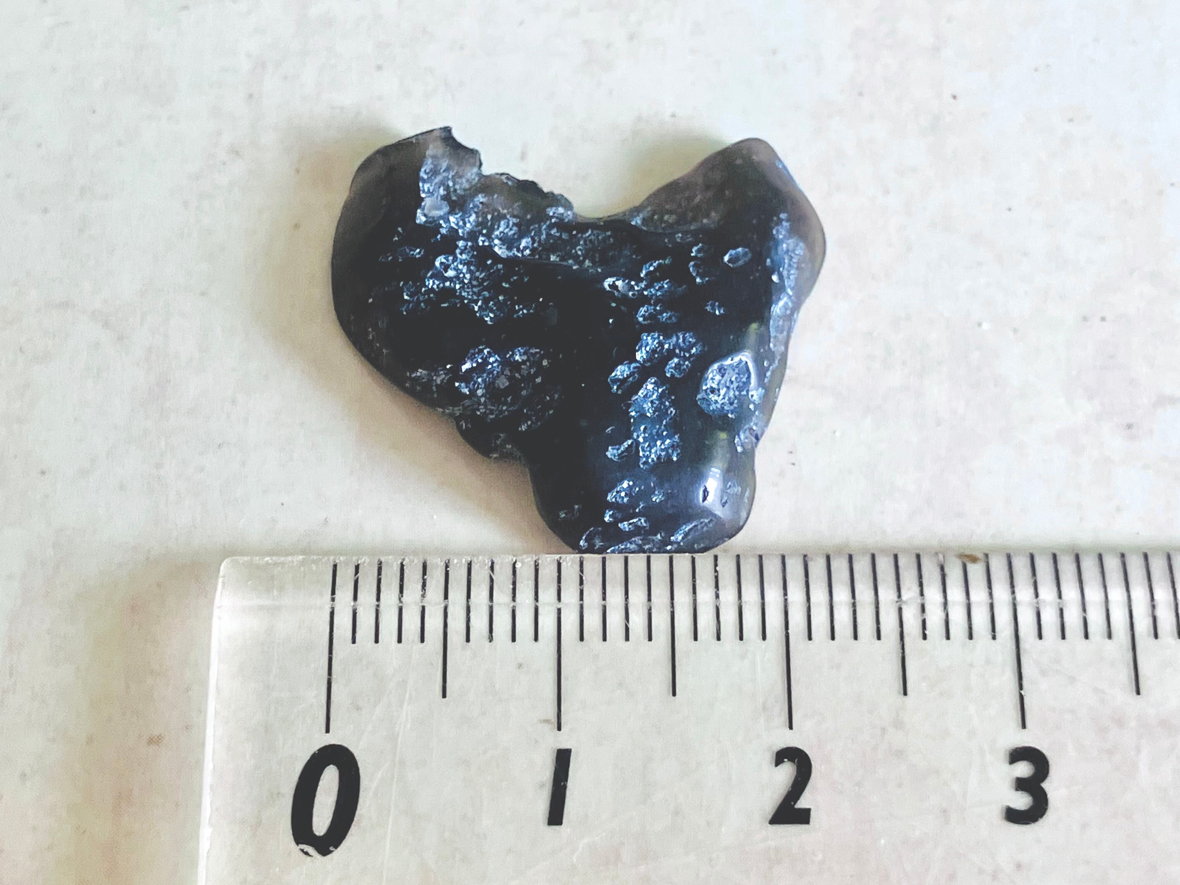 原石は黒く、全く光を通さないように思える見た目をしていますが、強い光を当てるとモルダバイトのように透かすことができます。