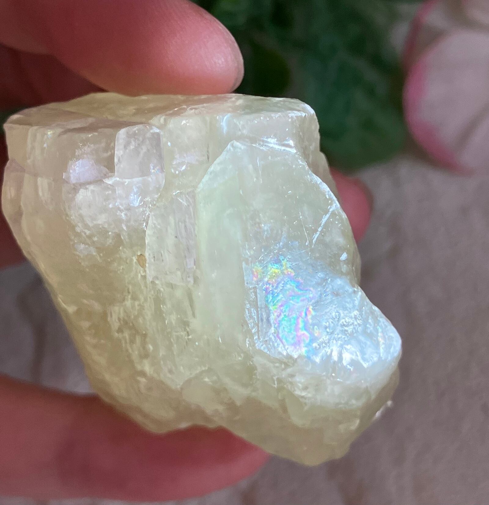 光の加減でレインボーがギラギラに輝く箇所があるエメラルドグリーンカルサイトのラフストーンです✨