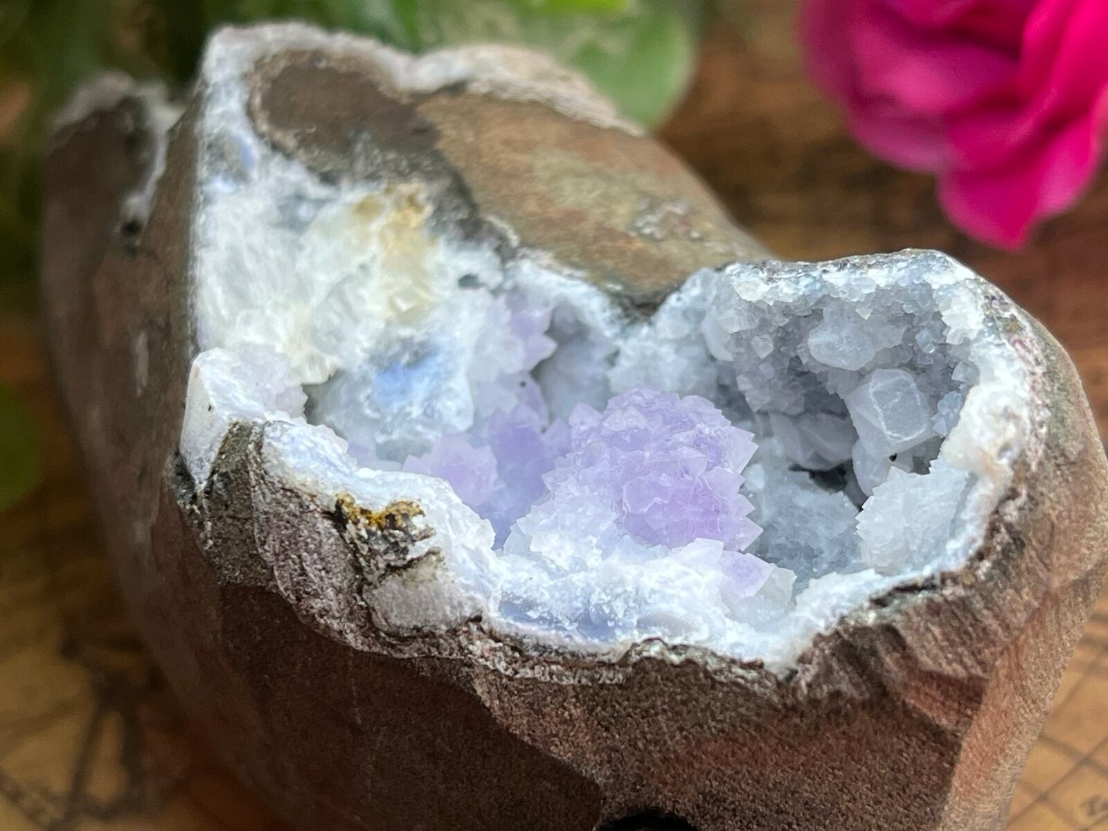 ホワイトのカルサイトが共生したインド マハラシュトラ産フラワーアメジストのジオードです✨