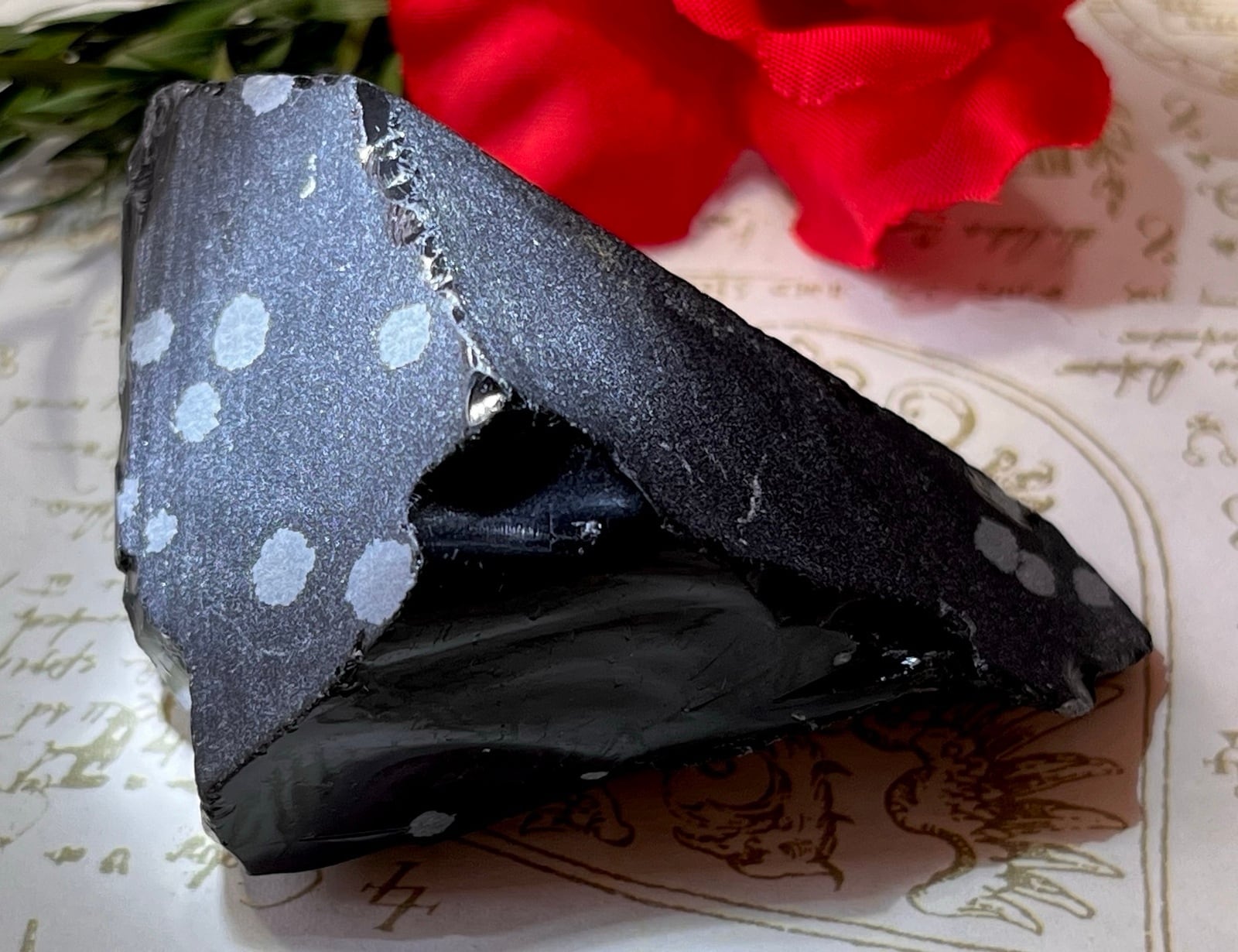 オブシディアンの中で、黒色の地石の中に雪の結晶のようなグレーの斑点模様が見られるものが「スノーフレークオブシディアン」と呼ばれます。鉱物の中にクリストバライト(方珪石)が内包することによってこの独特の模様が作られます。