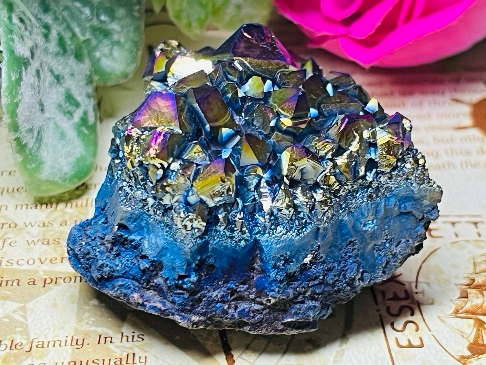 天然の水晶にイオン化した金属の蒸気を添加(蒸着)させた人工物になりますが、自然の物同士を錬金術的な組み合わせという事で、本来の水晶のパワーに上乗せし強化させてあると思われているようで、海外のヒーラーに好まれている石でもあります。