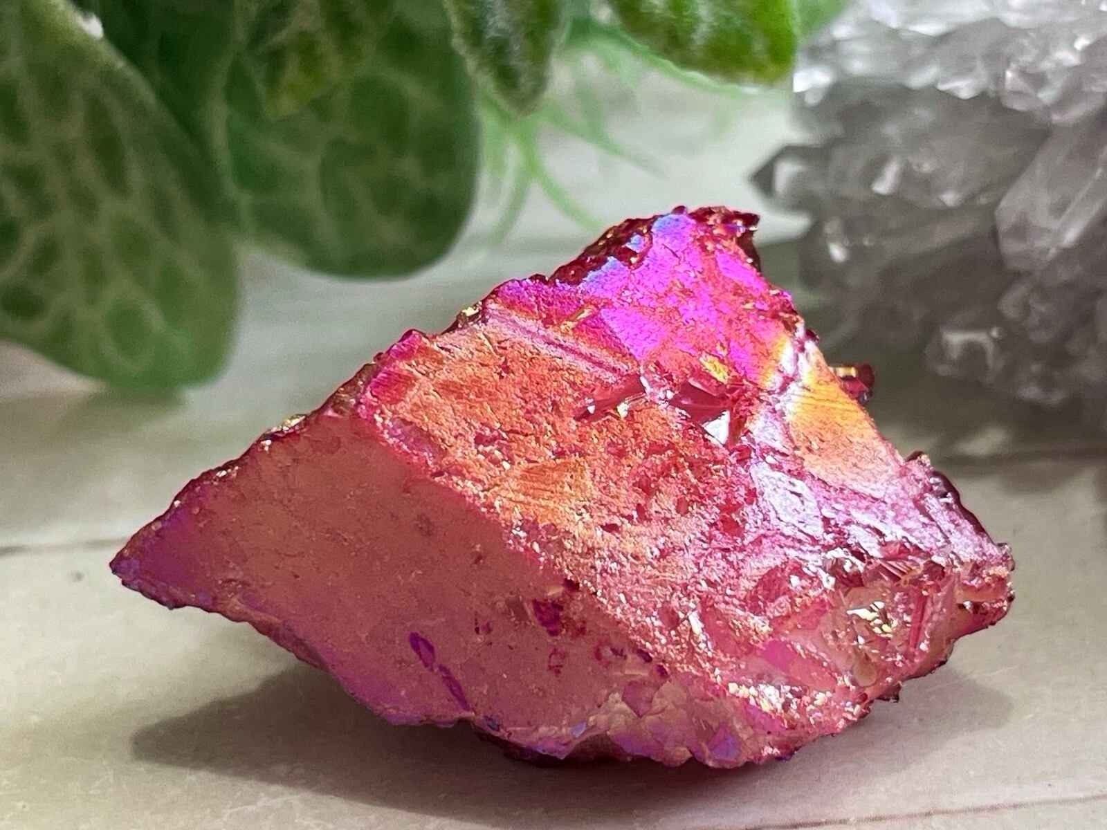 天然の水晶にイオン化した金属の蒸気を添加(蒸着)させた人工物になりますが、自然の物同士を錬金術的な組み合わせという事で、本来の水晶のパワーに上乗せし強化させてあると思われているようで、海外のヒーラーに好まれている石でもあります。