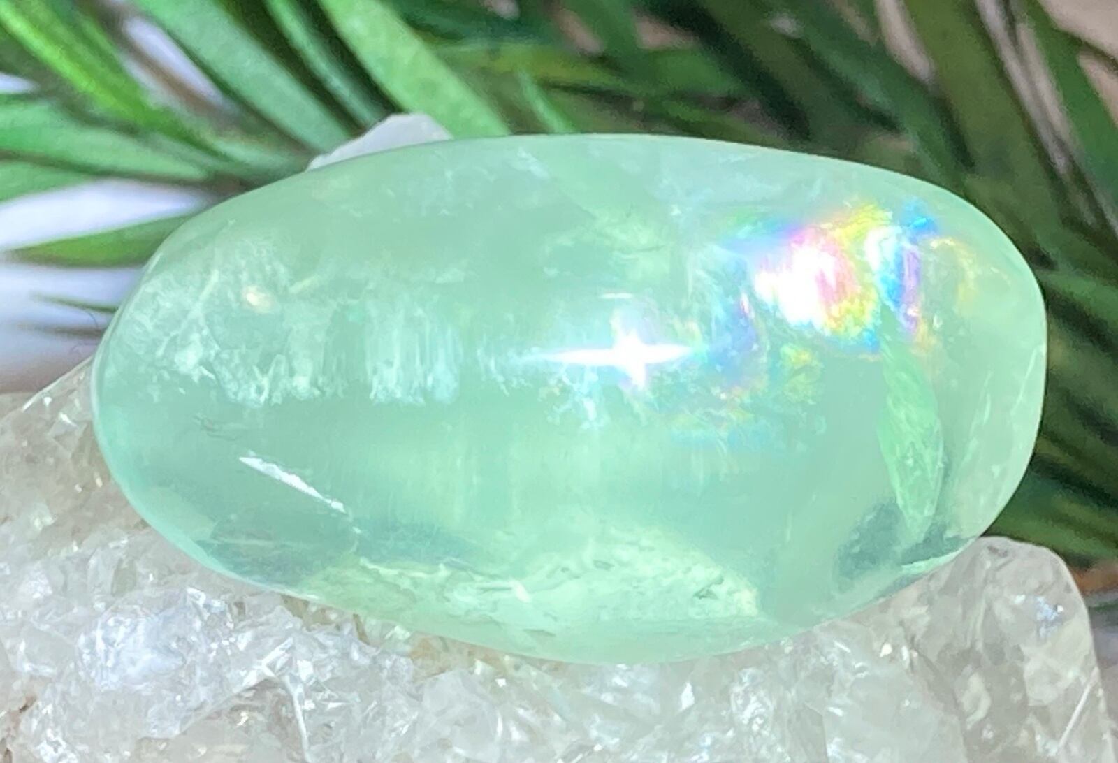 エメラルドグリーンに壮麗なレインボーが輝くフローライトのタンブルです。