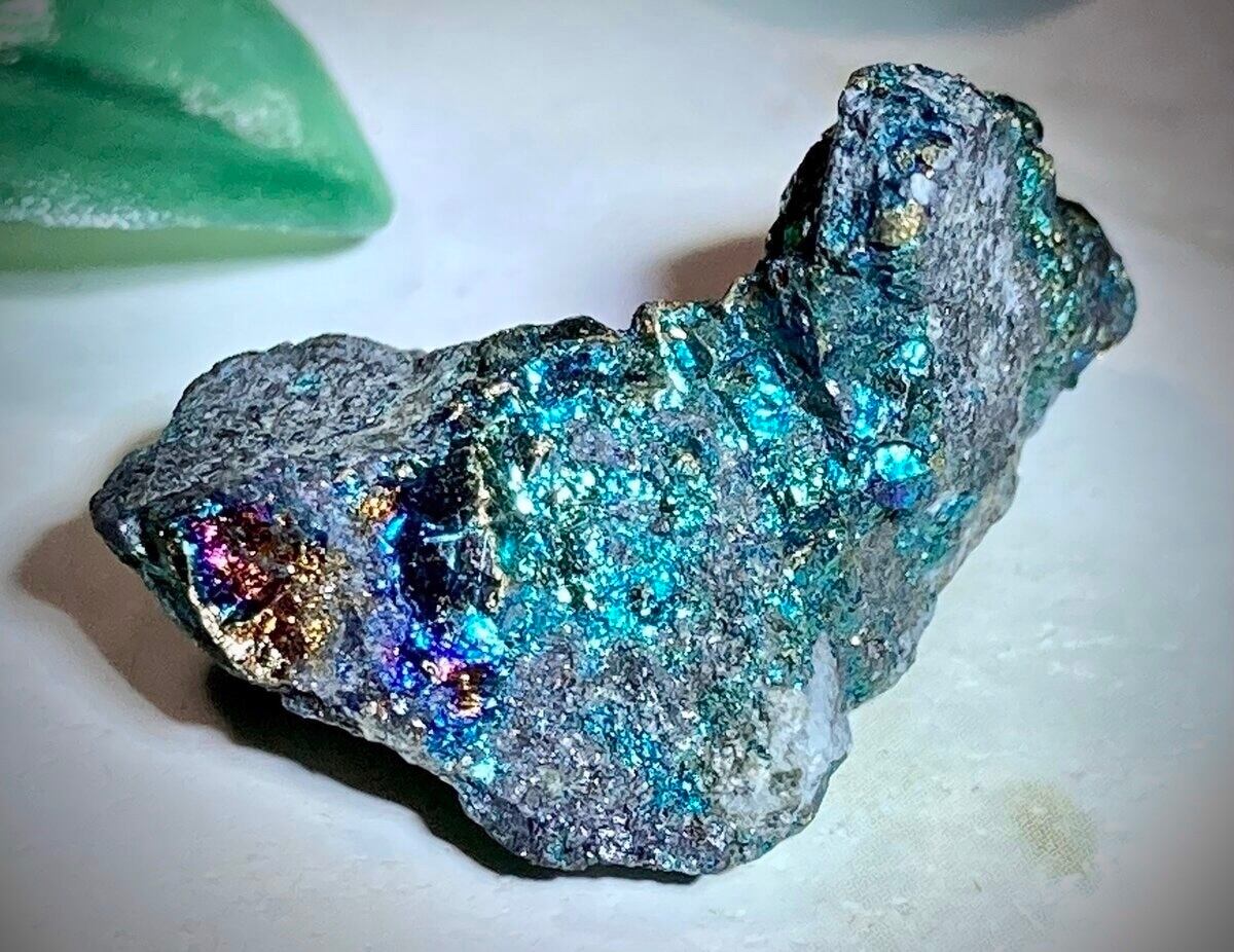 こちらは天然のキャルコパライト(黄銅鉱)で珍しくピーコックオアのような鮮やかな発色があります- ̗̀꒰ঌ໒꒱ ̖́-