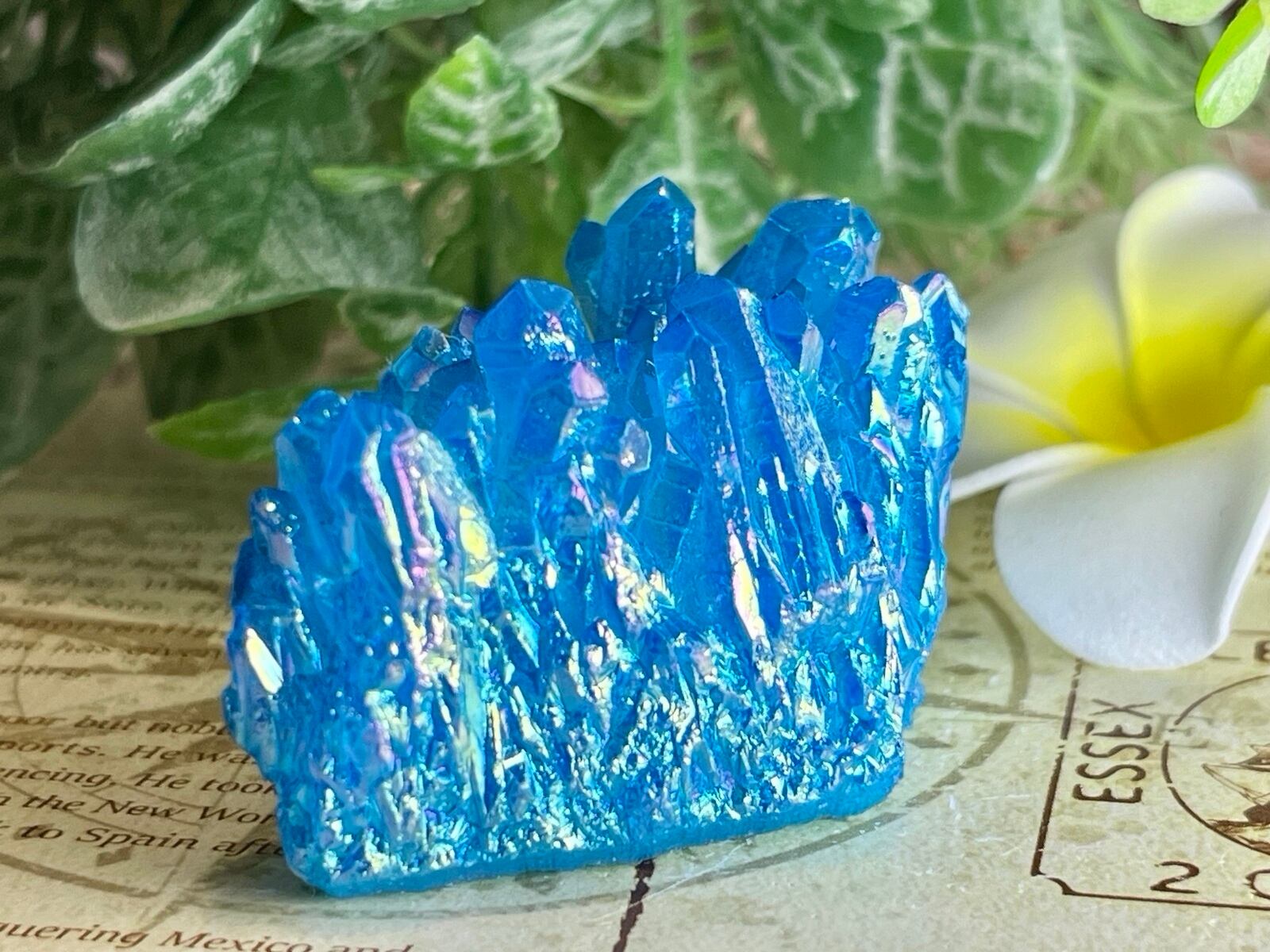 天然の水晶にイオン化した金属の蒸気を添加(蒸着)させた人工物になりますが、自然の物同士を錬金術的な組み合わせという事で、本来の水晶のパワーに上乗せし強化させてあると思われているようで、海外のヒーラーに好まれている石でもあります。
