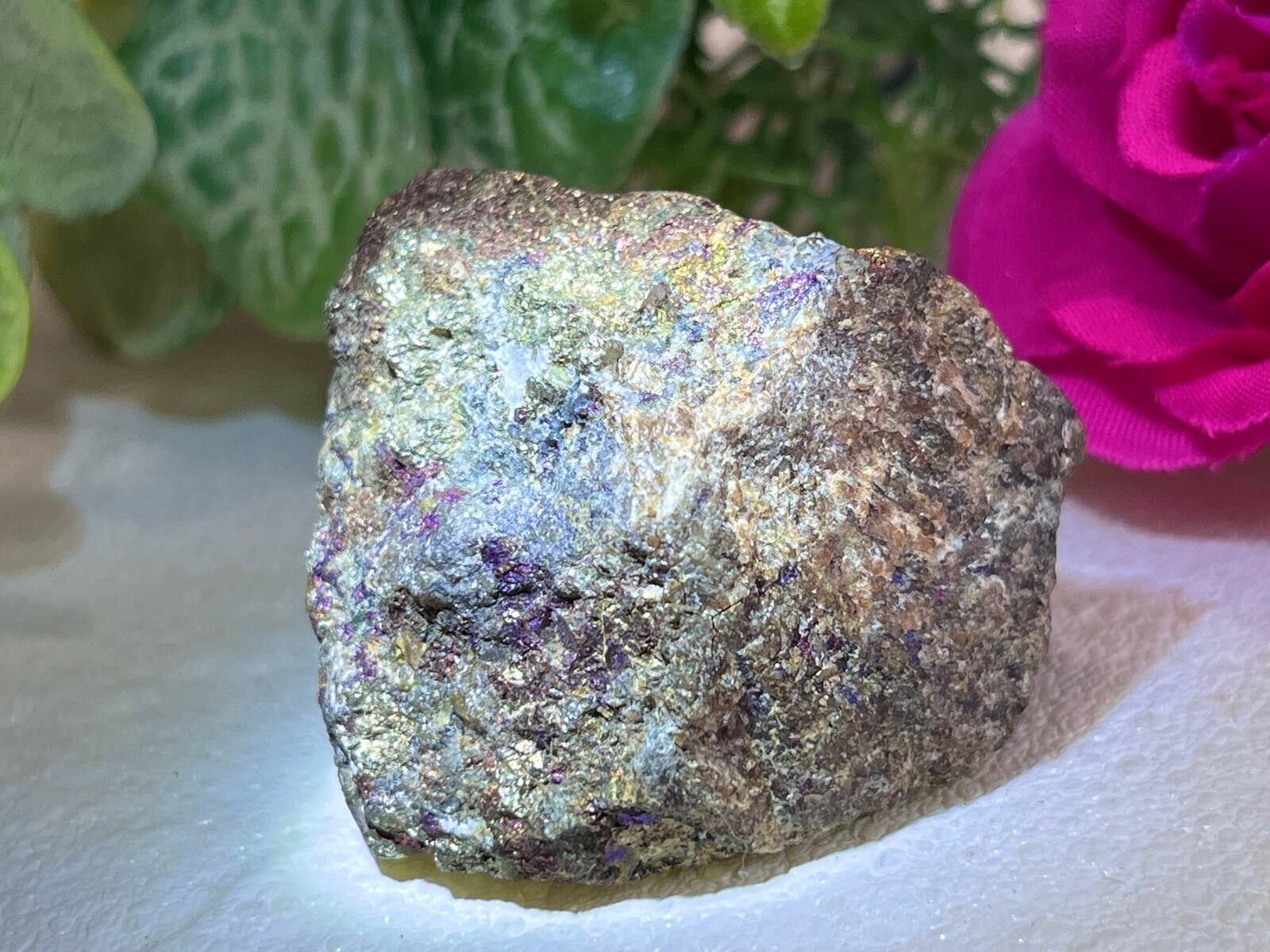 七色に光る石、ゲーサイトに所々金色のパイライトが内包された珍しいラフストーンです╰(*´︶`*)╯