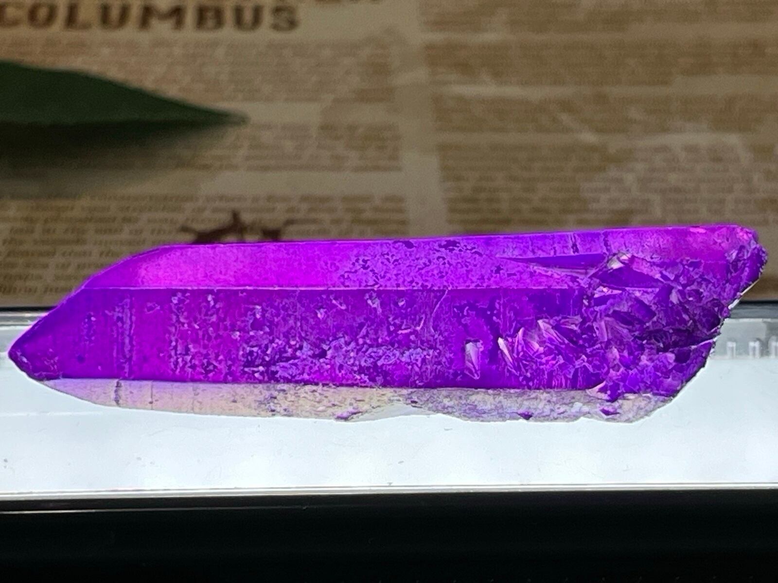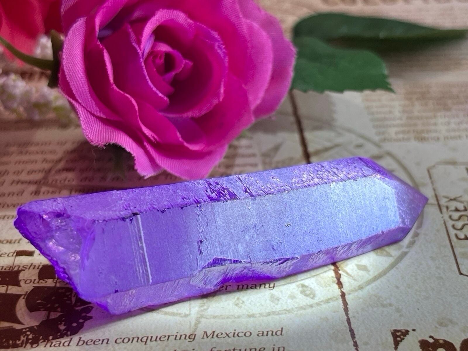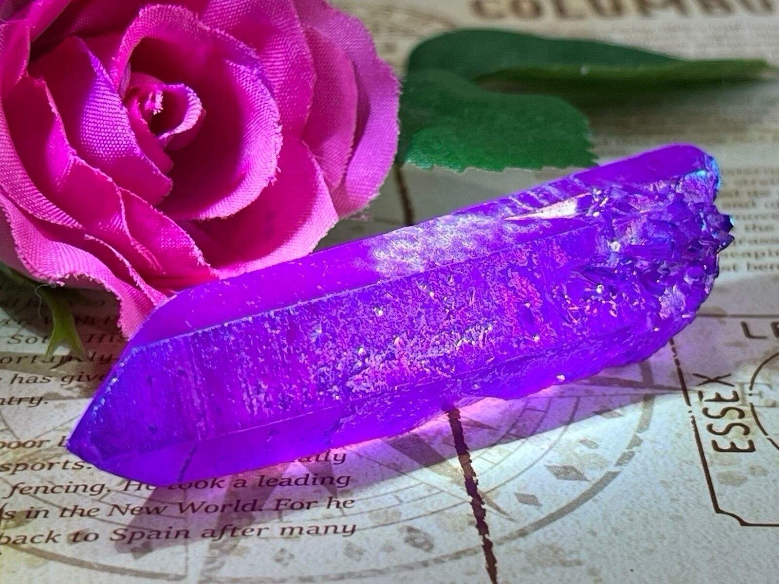天然の水晶にイオン化した金属の蒸気を添加(蒸着)させた人工物になりますが、自然の物同士を錬金術的な組み合わせという事で、本来の水晶のパワーに上乗せし強化させてあると思われているようで、海外のヒーラーに好まれている石でもあります。