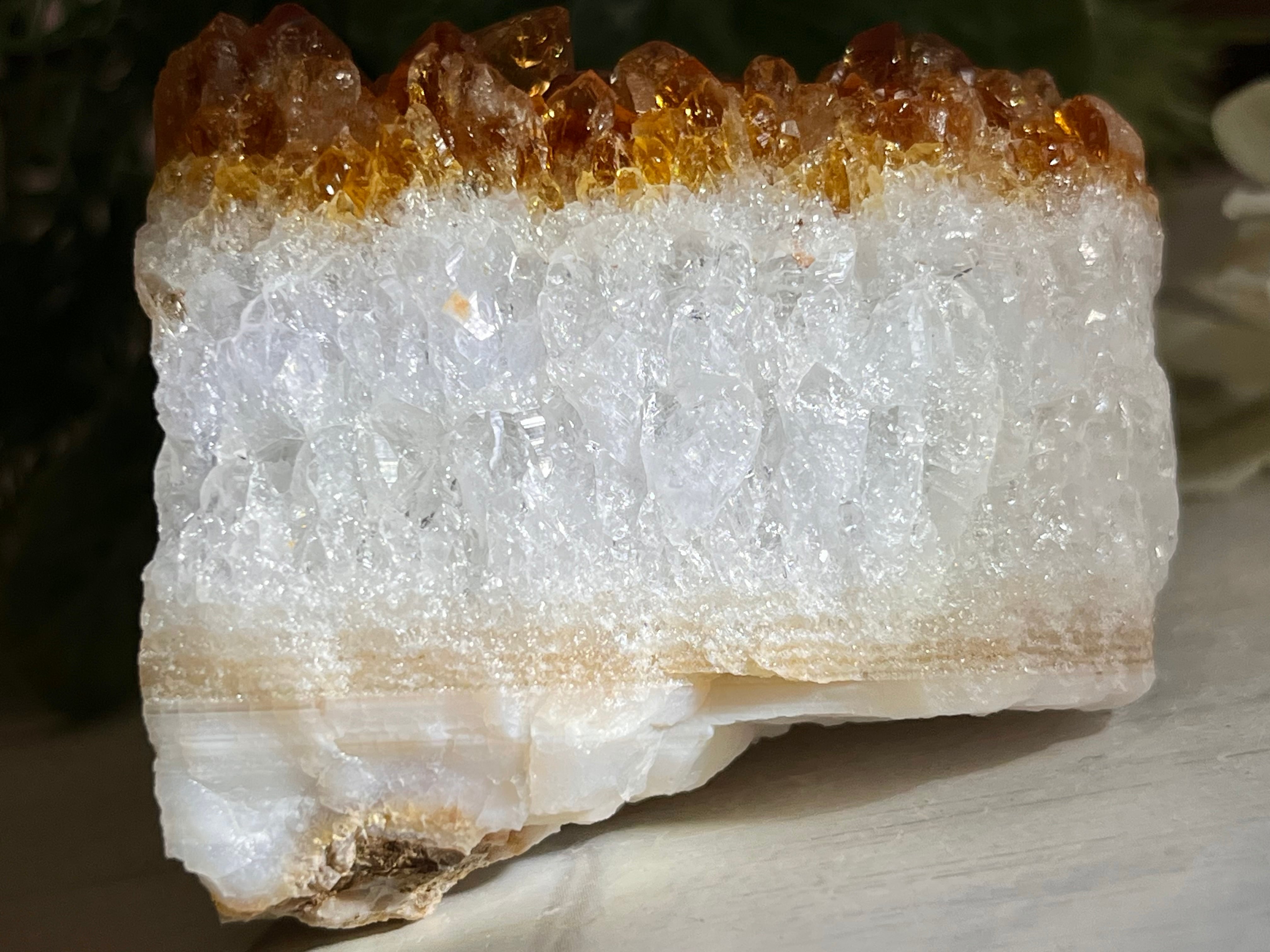 一見するとシトリンクォーツなのですが、光を当てるとアメジストの結晶が混ざったミステリアスなアメトリン クラスター°⌖꙳(画像2枚目参照)