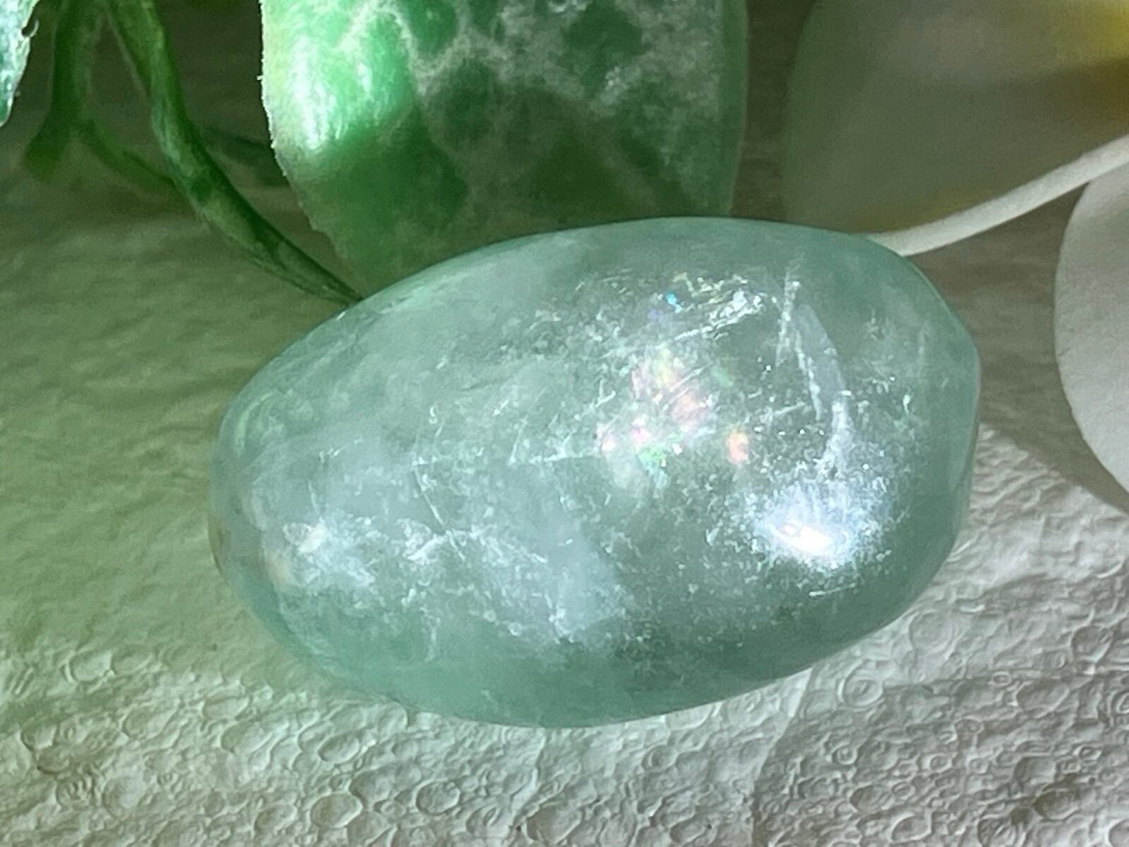 エメラルドグリーンに壮麗なレインボーが輝くフローライトのタンブルです❁⃘*.゜