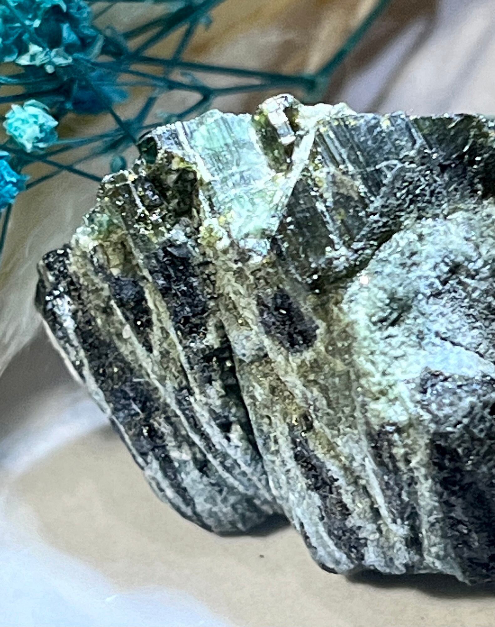 グリーントルマリンとブラックトルマリンがミックスされた珍しい原石です。