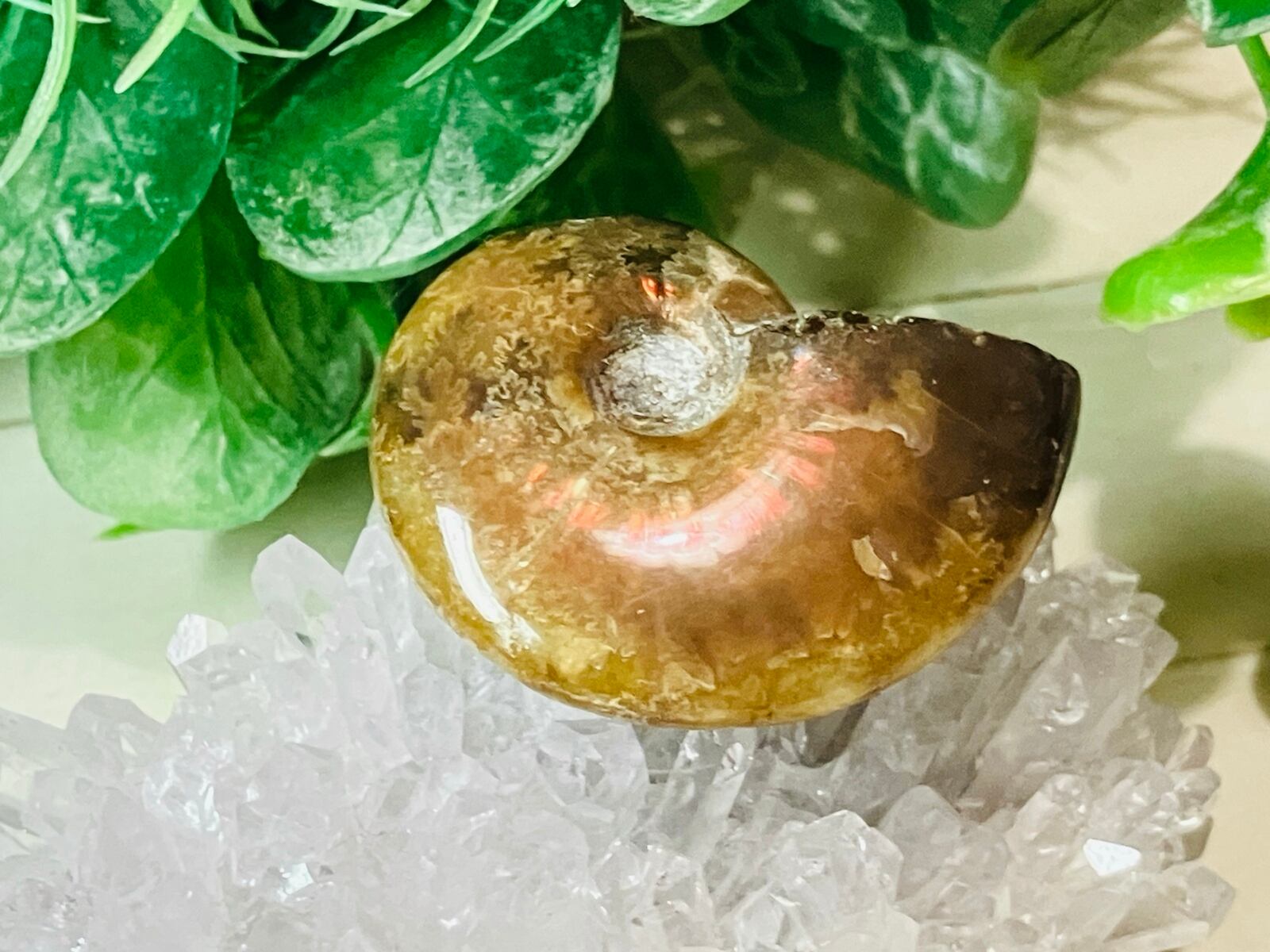 美しい七色の輝きを放つオパール化したアンモナイトの化石(虹入りアンモライト)です✨