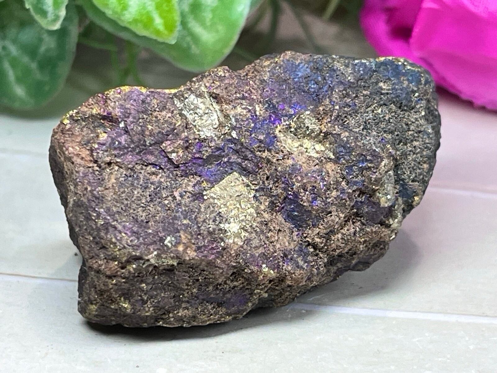 七色に光る石、ゲーサイトに所々金色のパイライトが内包された珍しいラフストーンです。