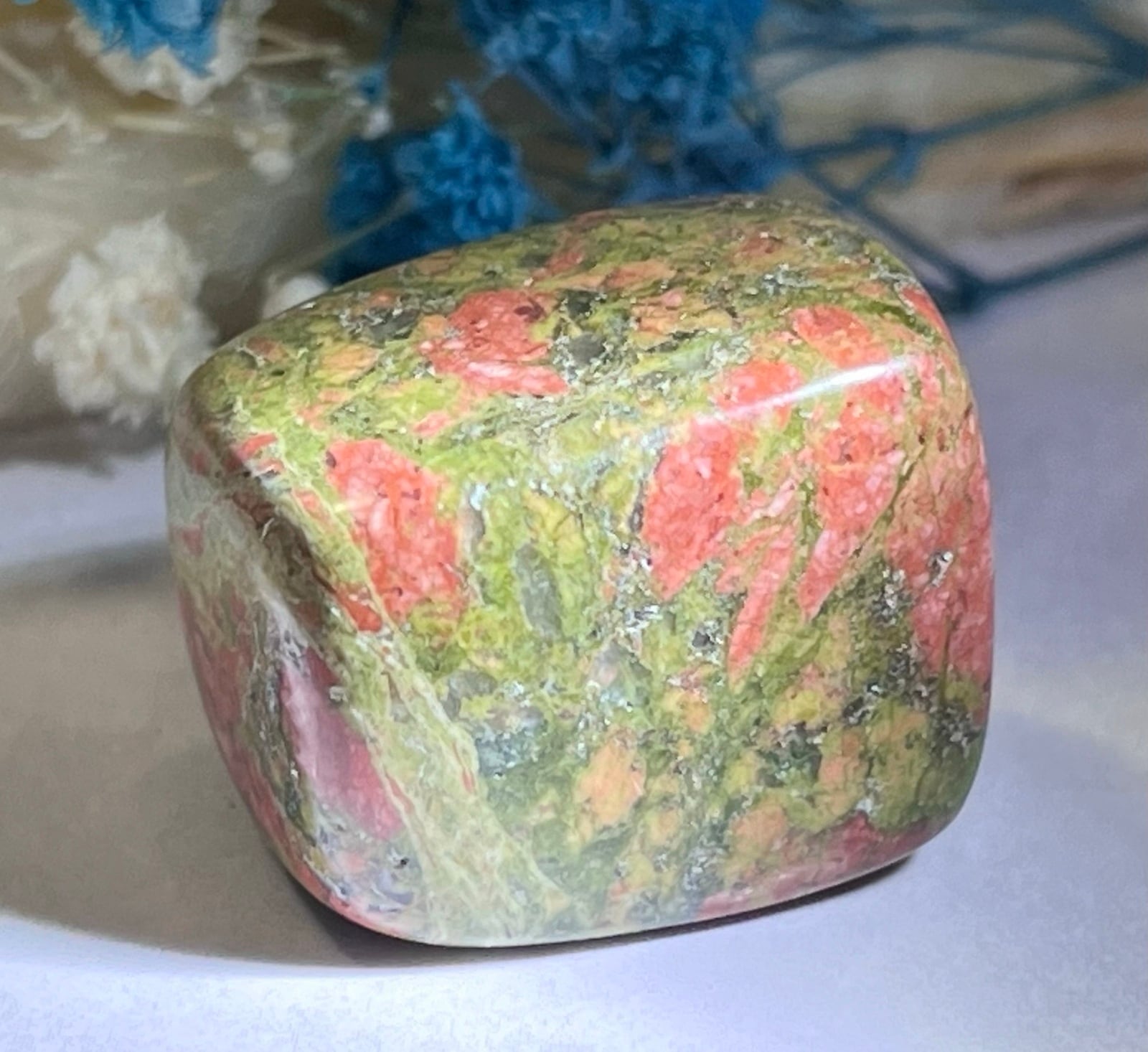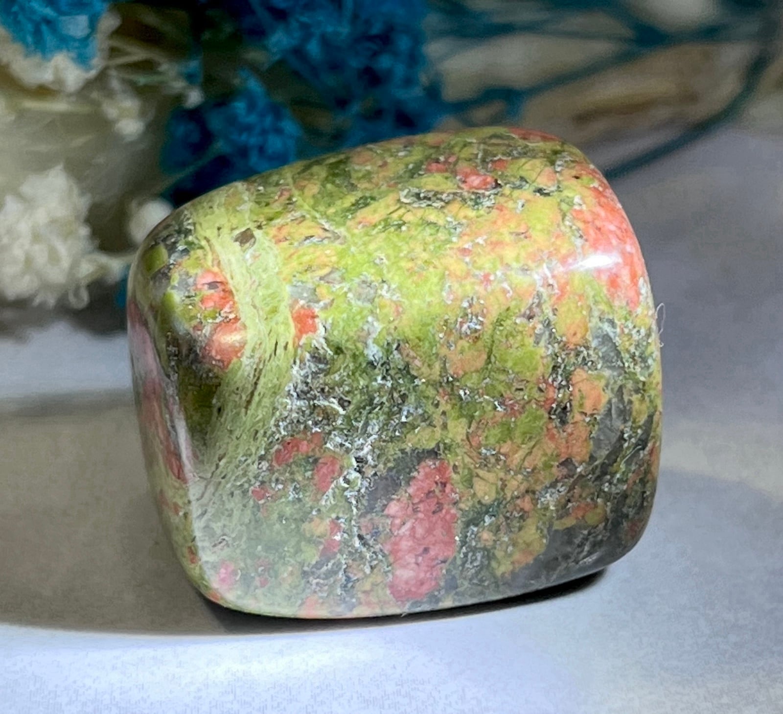 ユナカ山地という産出場所にちなんだ名前がついたユナカイトのタンブルです✨