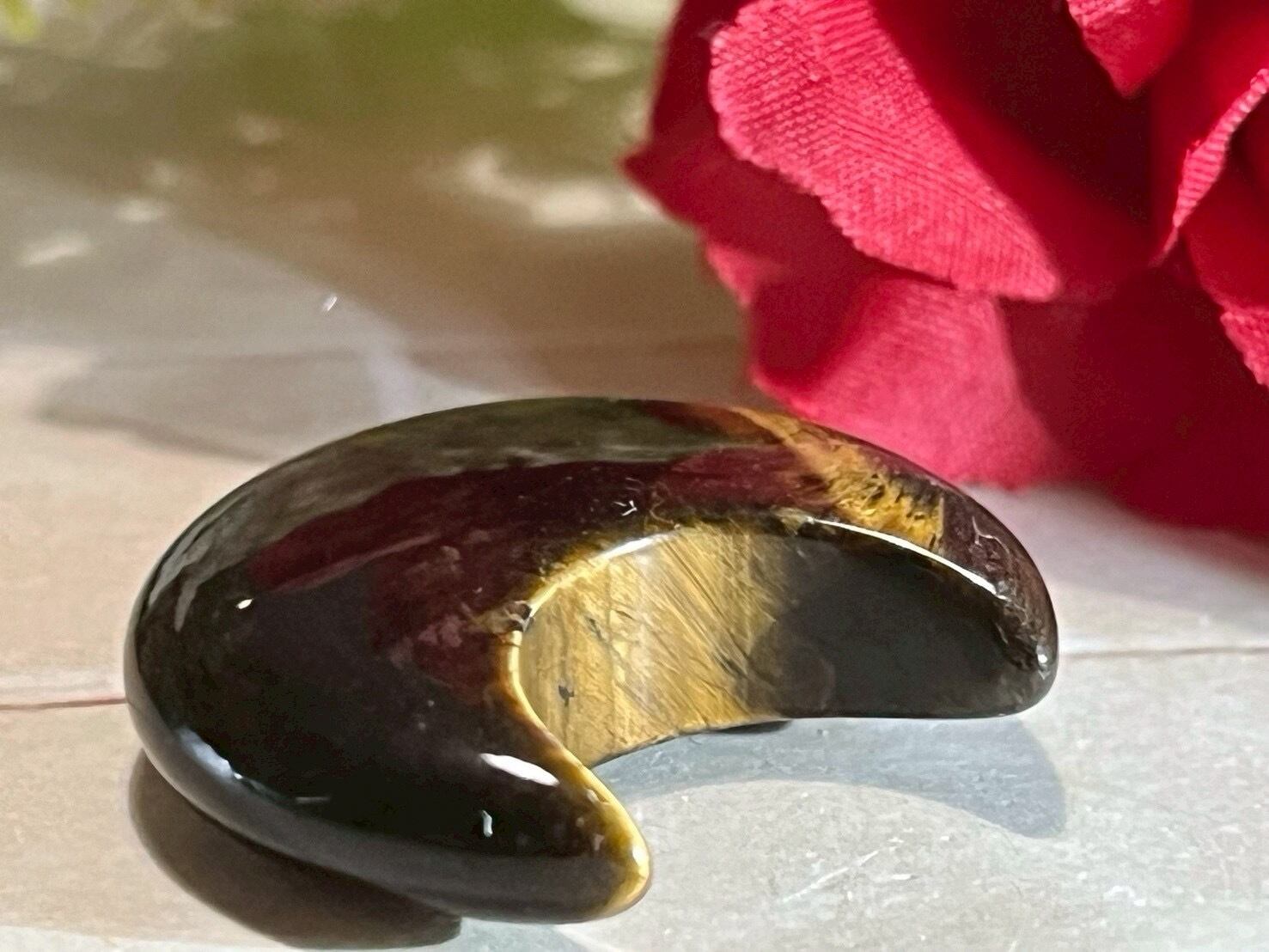 光を当てる角度によって側面に美しいシラーが煌めくタイガーアイのムーン形タンブルです✨