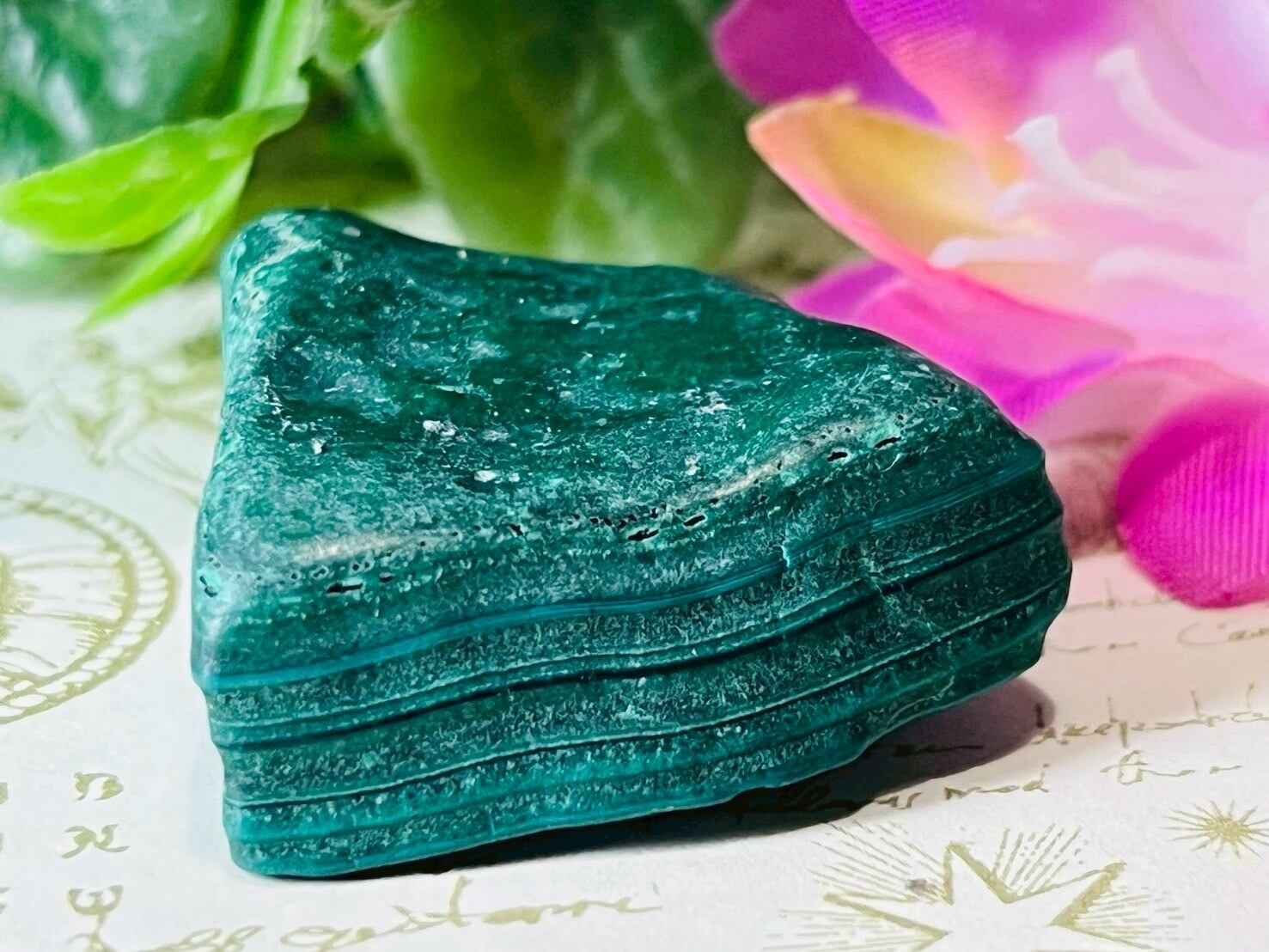 独特の縞模様が美しいピーコックグリーン マラカイトのタンブルです。