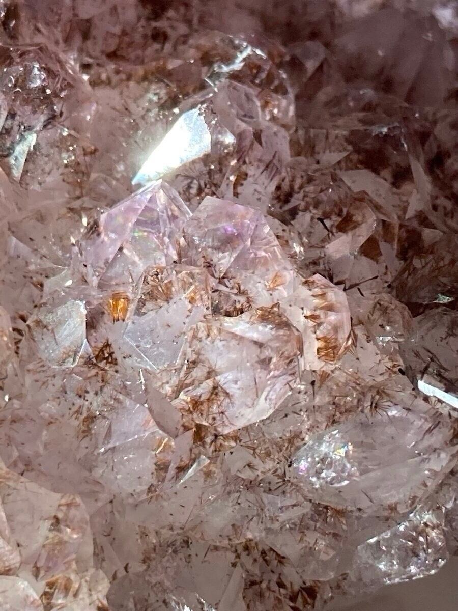 ライトを当てる角度によってキラキラと虹も煌めく結晶もあります。