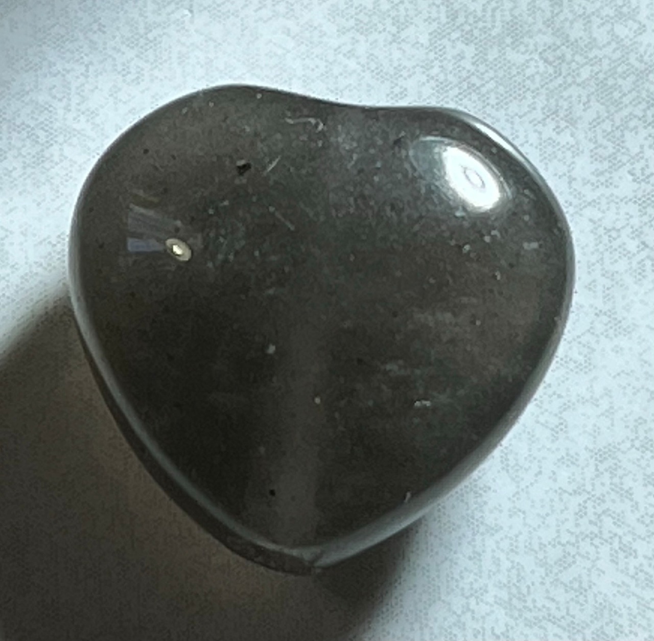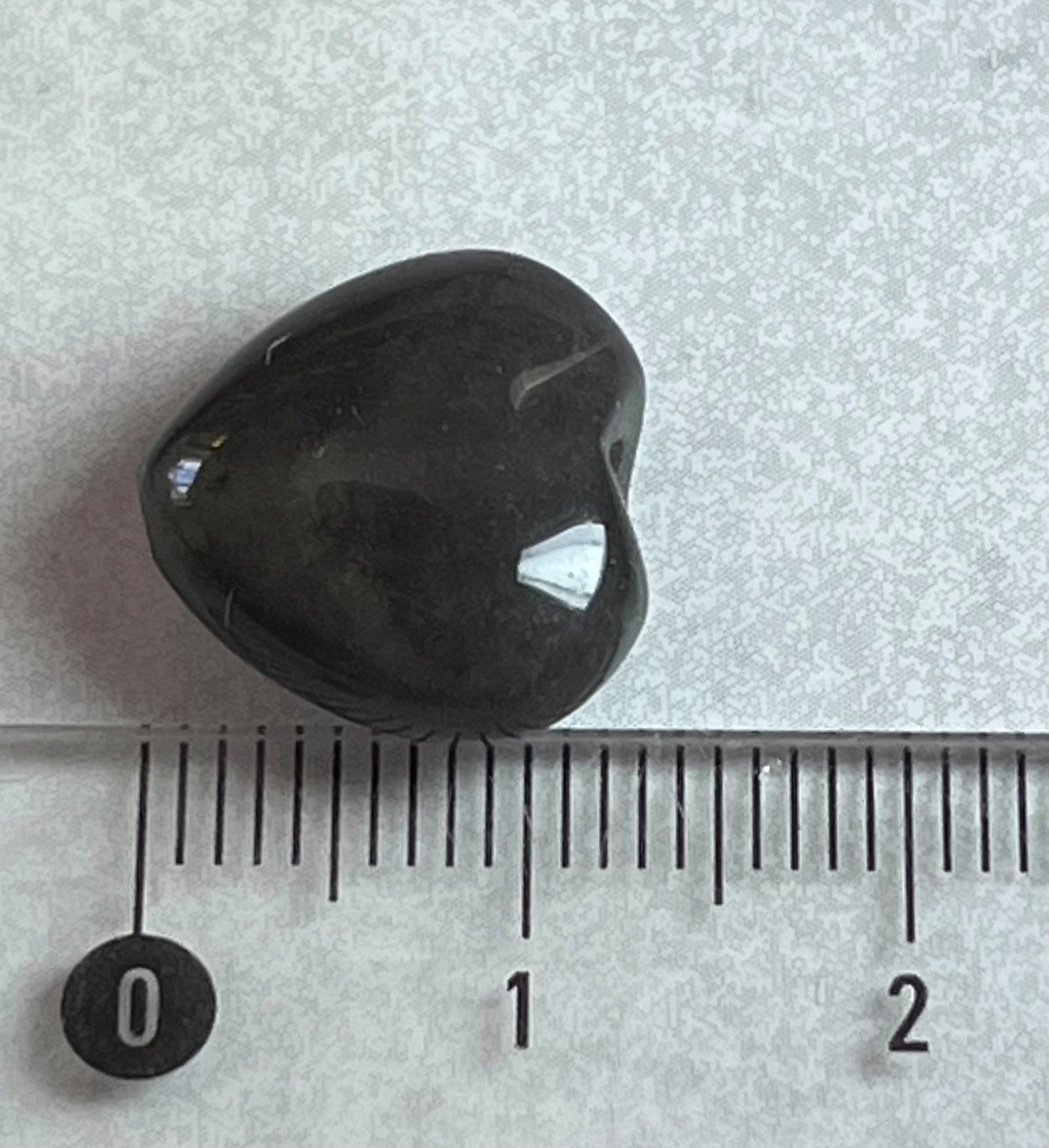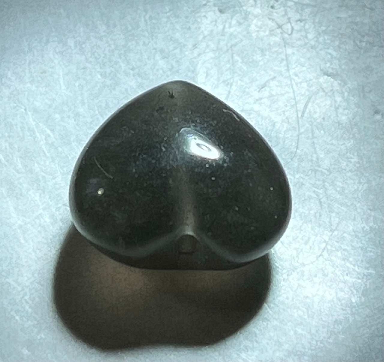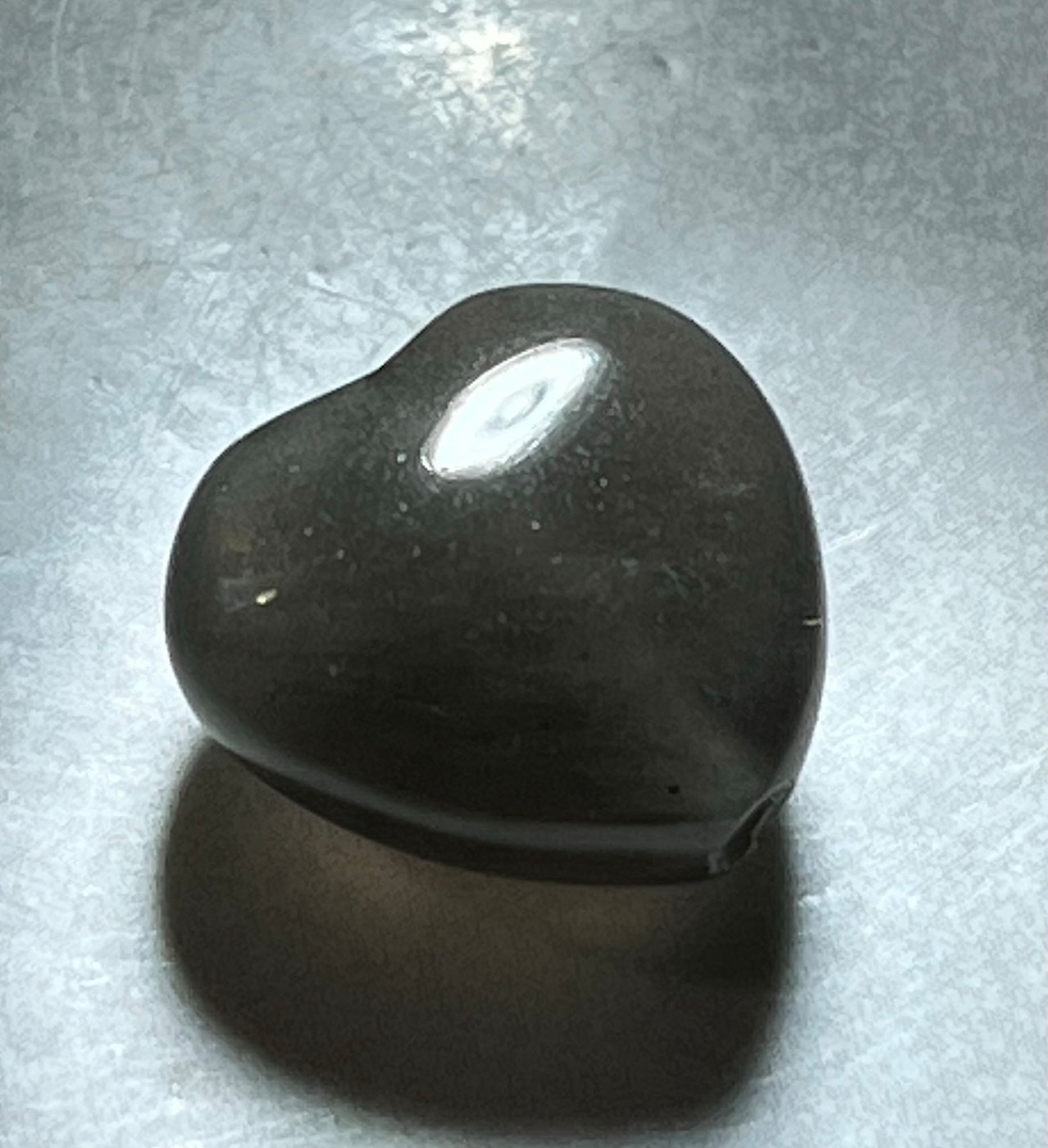 原石は黒く、全く光を通さないように思える見た目をしていますが、強い光を当てるとモルダバイトのように透かすことができます。