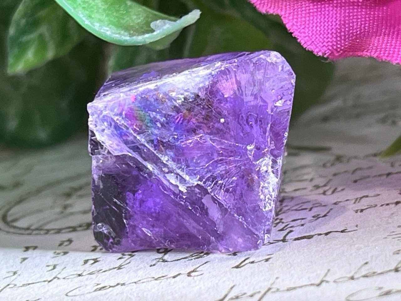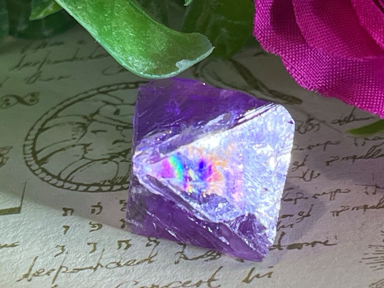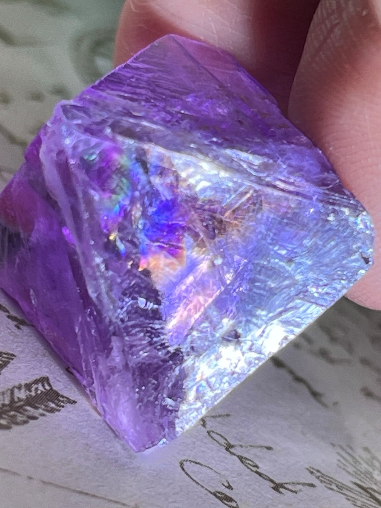 ライトを当てる角度によって壮麗なレインボーが煌めくイリノイ州産のパープルフローライト原石です✨