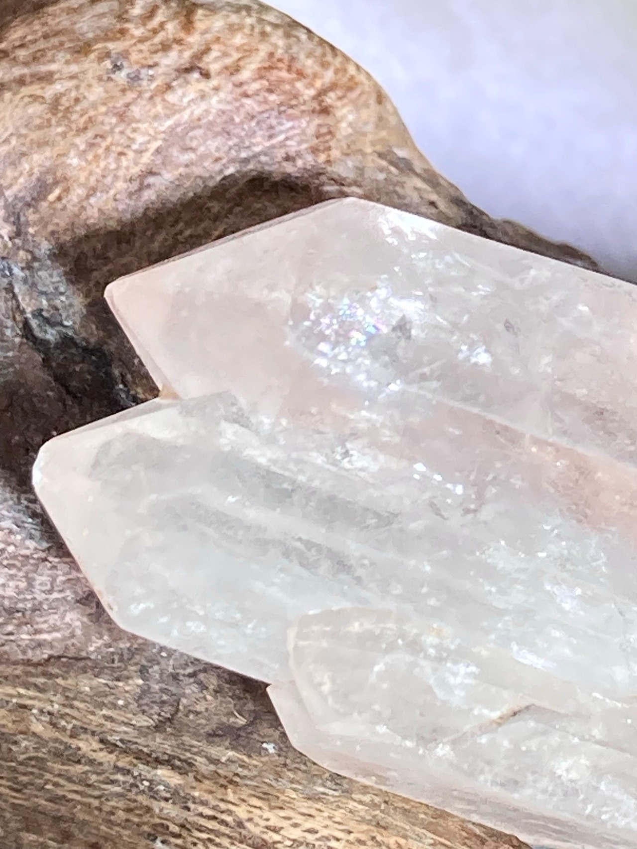 お色はほんのりピンクでレムリアンリッジもハッキリしていて、ライトを当てると綺麗なレインボーが出る箇所もあります。