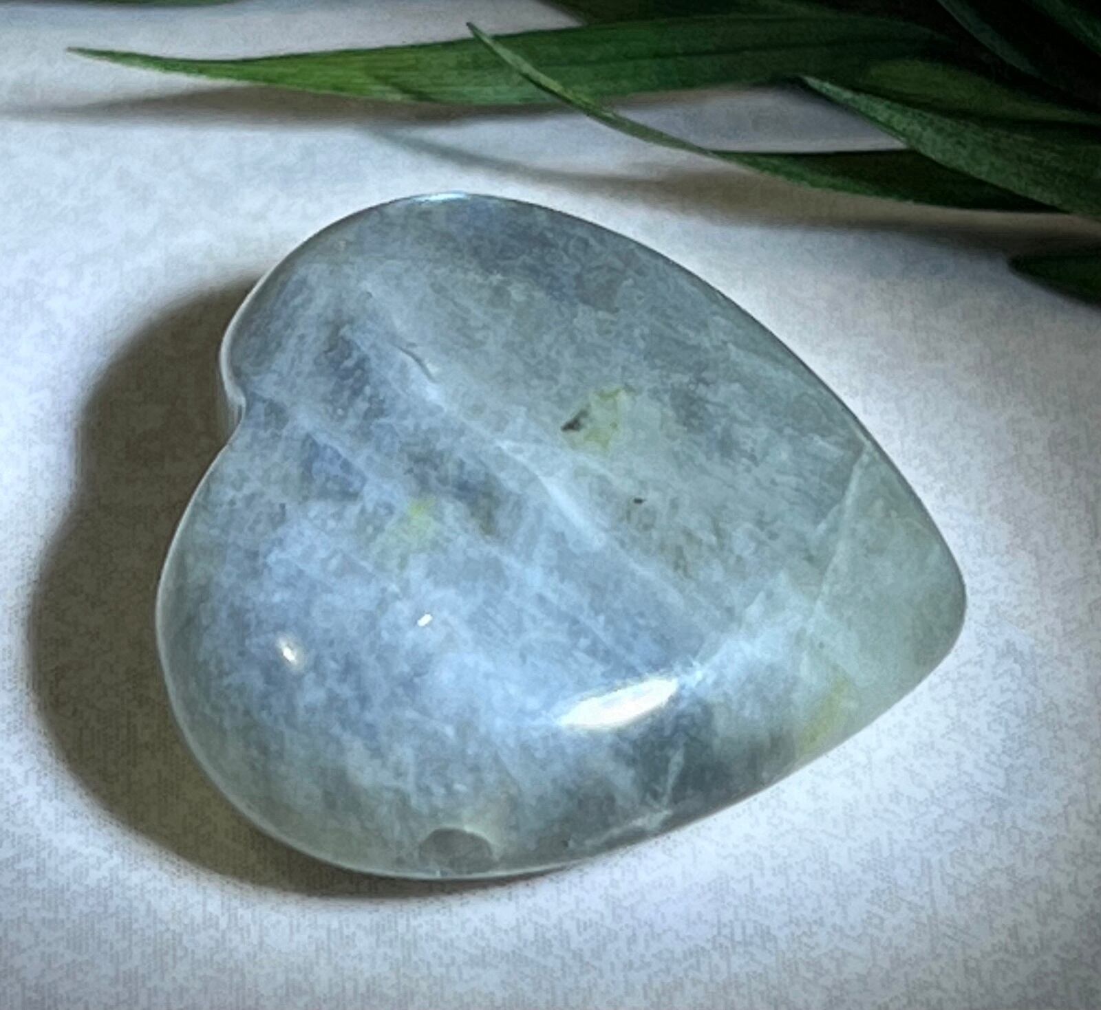 ブルーのレッセンスが煌めくホワイトラブラドライトがベースで一部オリーブのラブラドライトがミックスされたハート型穴あきパーツです- ̗̀꒰ঌ໒꒱ ̖́-
