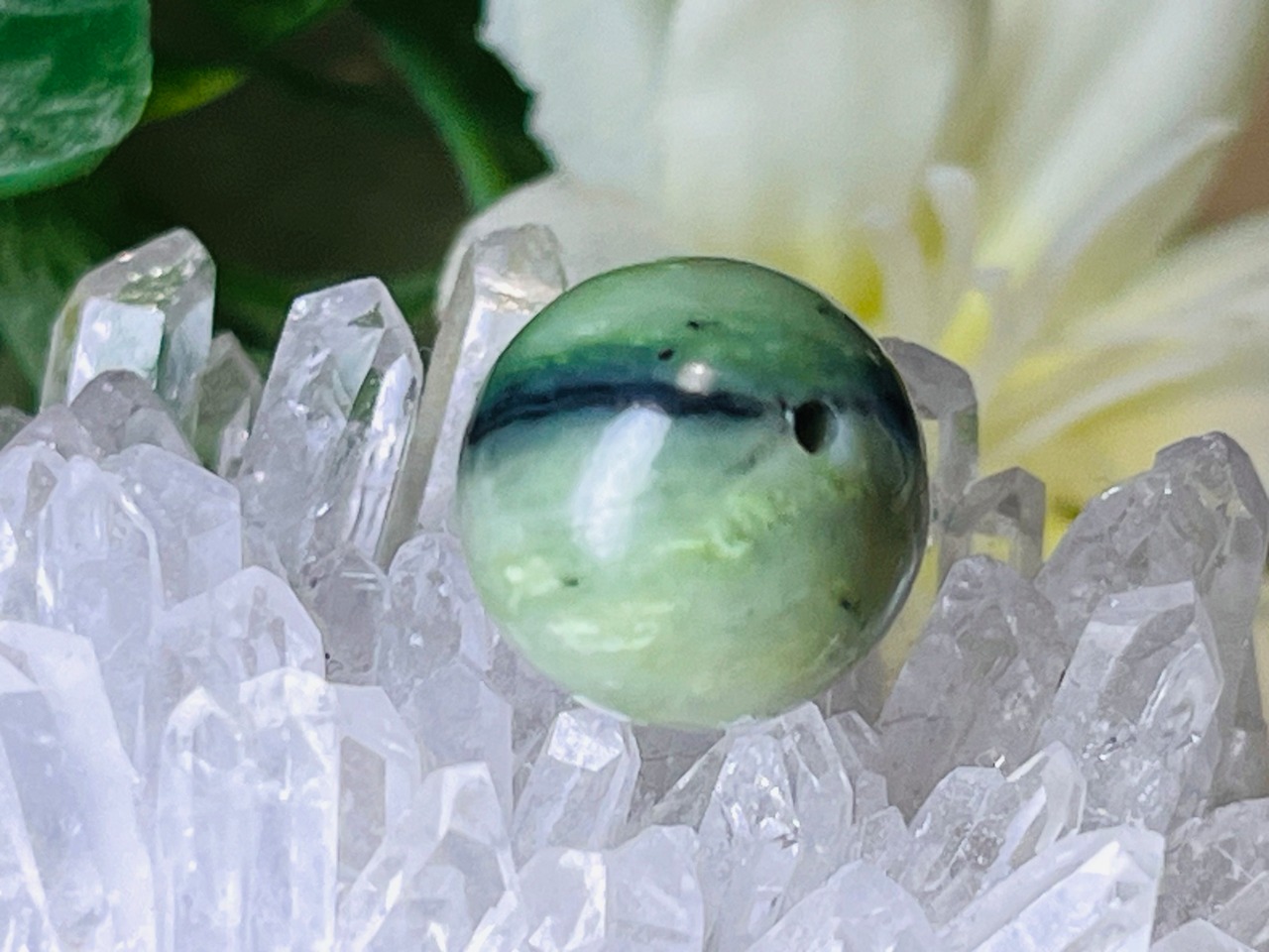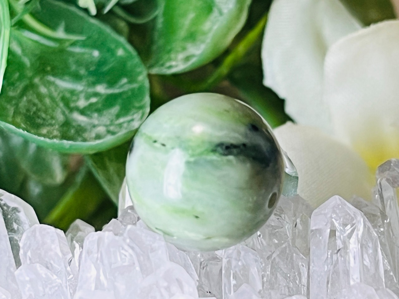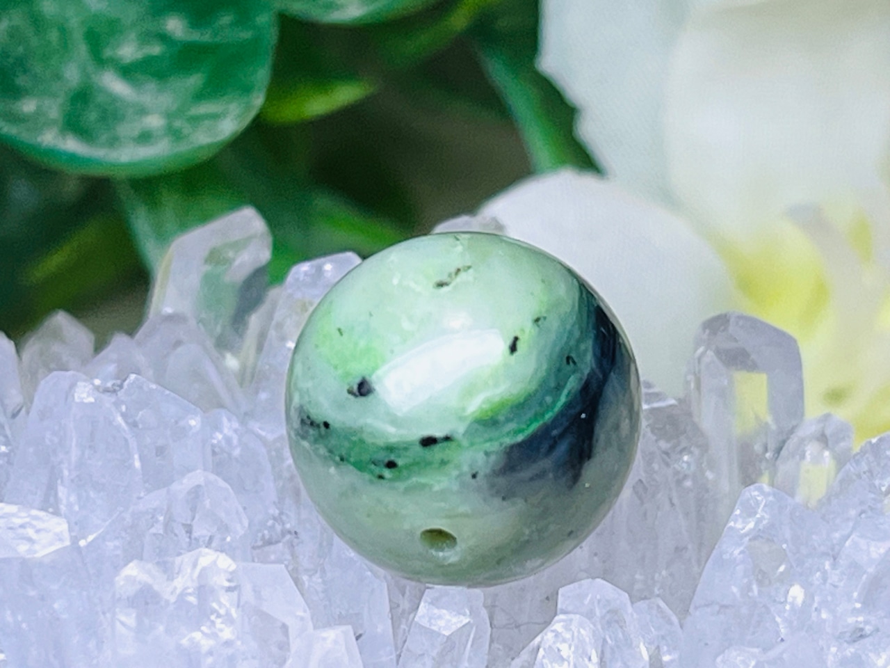 蓬色で独特な模様が美しい日高翡翠の穴あき丸玉です❁⃘*.゜
