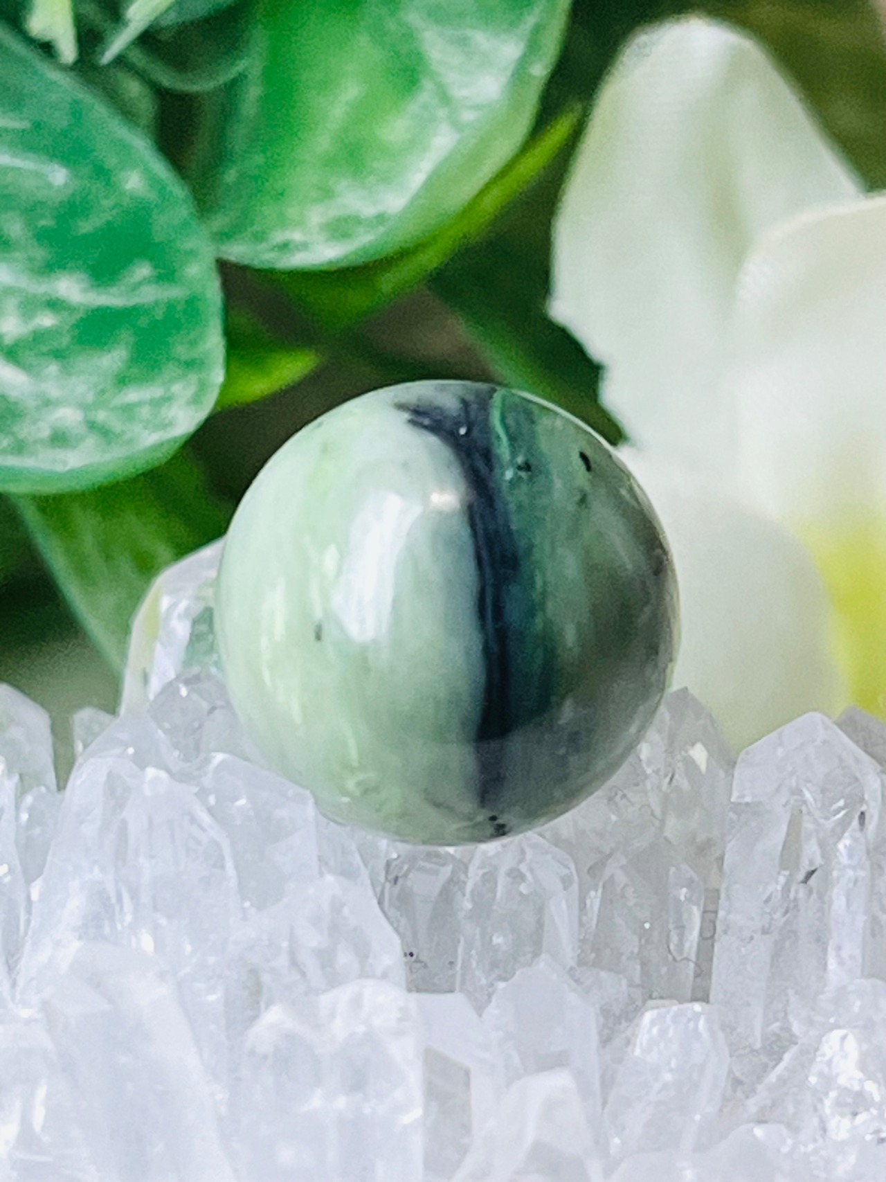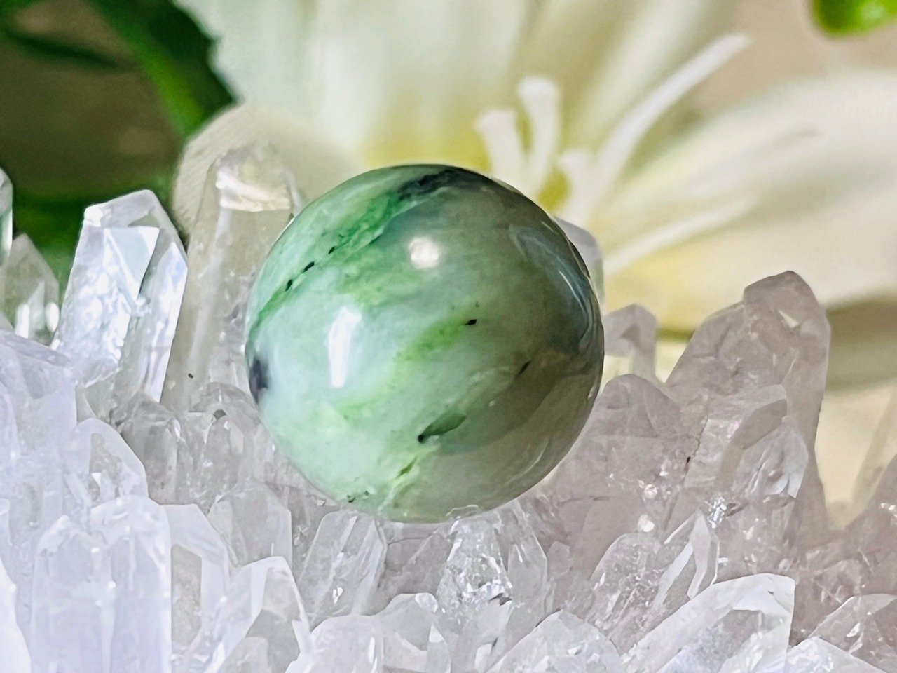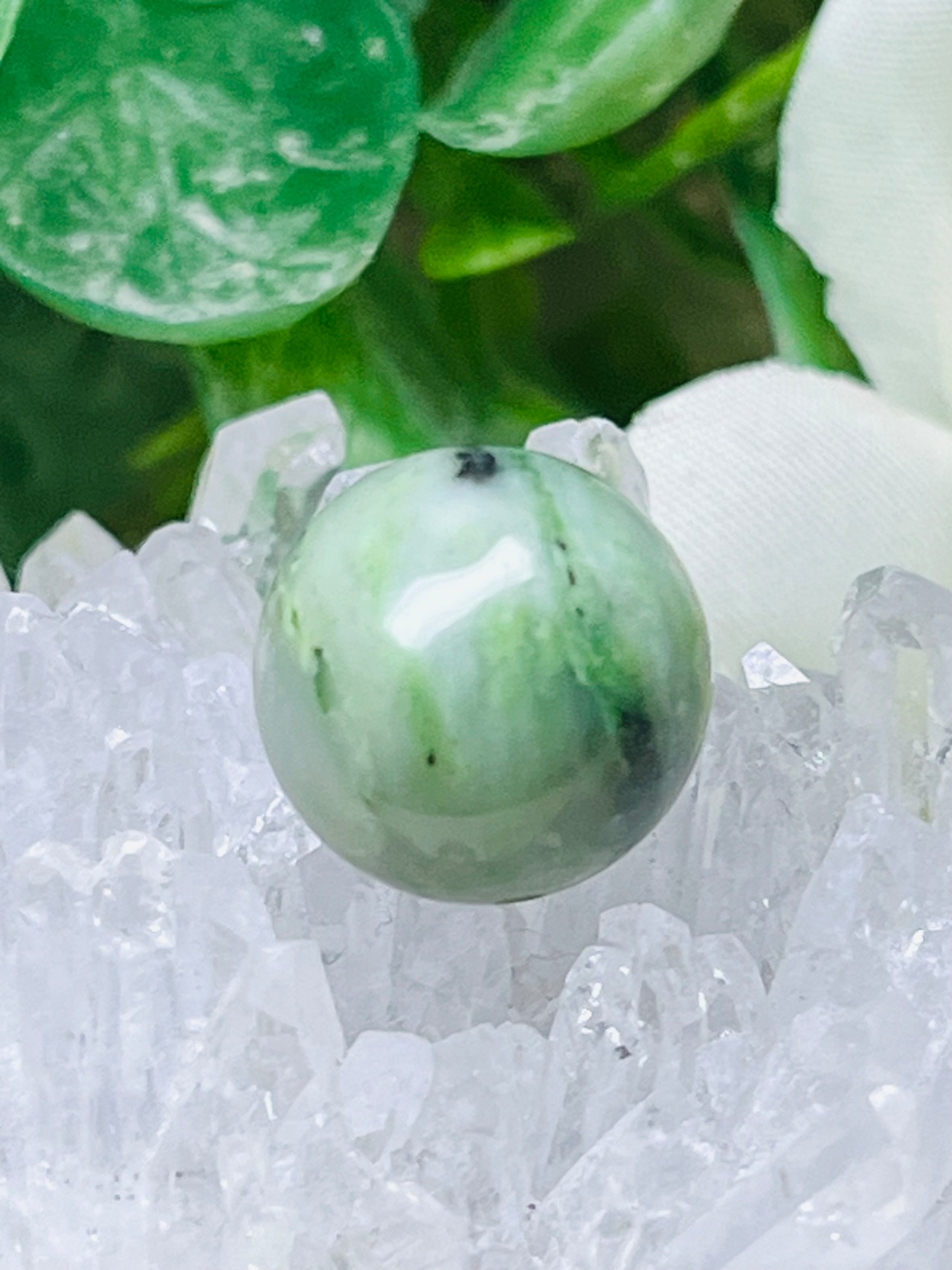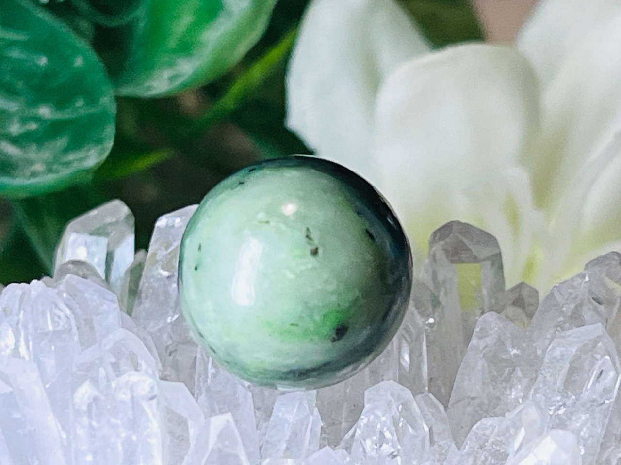 蓬色で独特な模様が美しい日高翡翠の穴あき丸玉です❁⃘*.゜