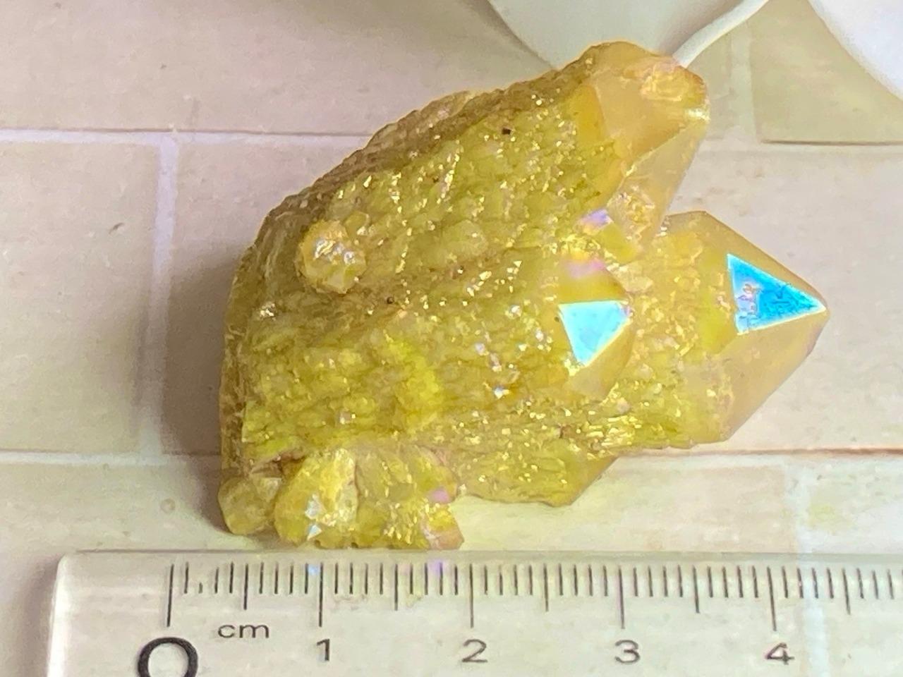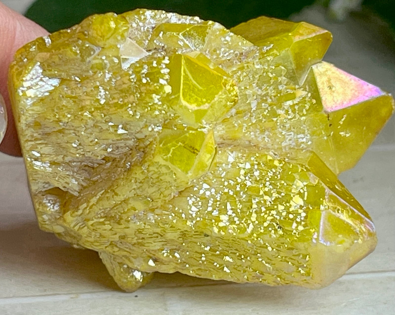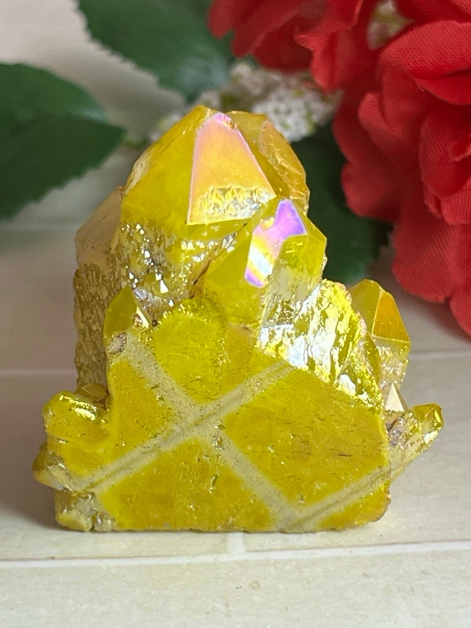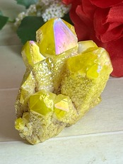 天然の水晶にイオン化した金属の蒸気を添加(蒸着)させた人工物になりますが、自然の物同士を錬金術的な組み合わせという事で、本来の水晶のパワーに上乗せし強化させてあると思われているようで、海外のヒーラーに好まれている石でもあります。