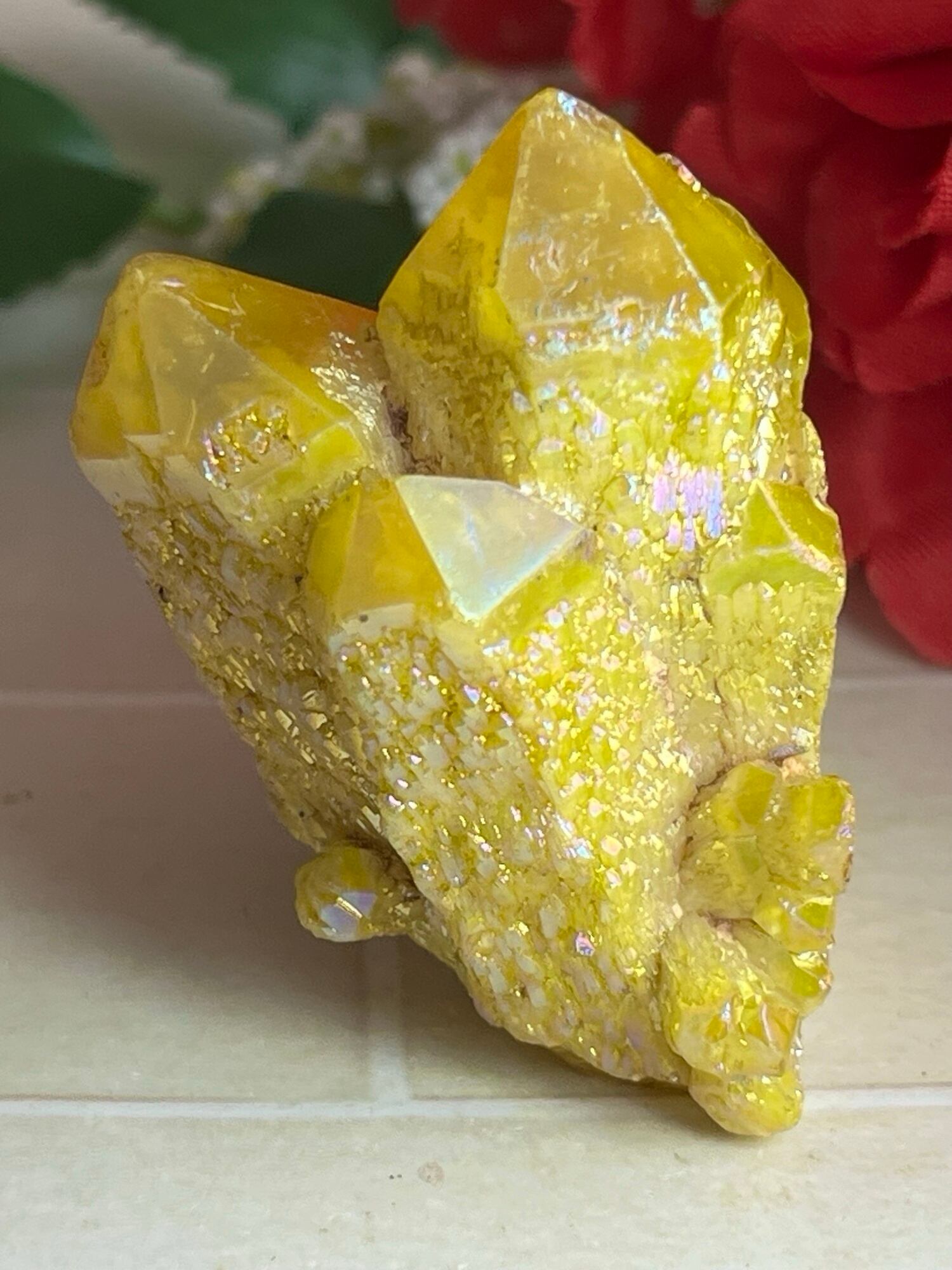 トロトロと溶けたような風合いのキャンドルクォーツにオーラ加工を施したクラスターです໒꒱°⌖꙳