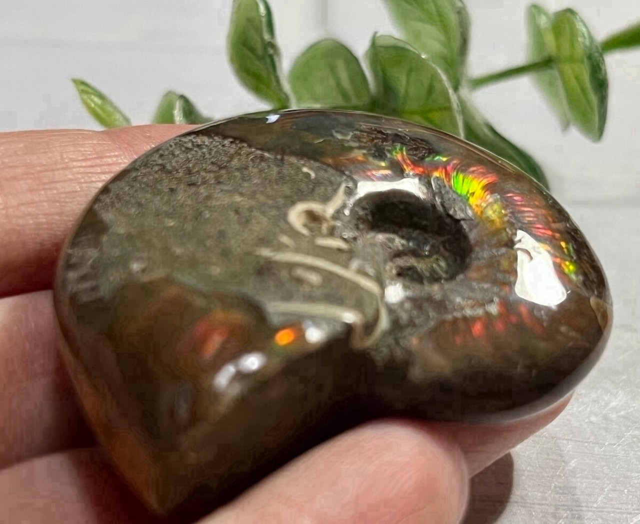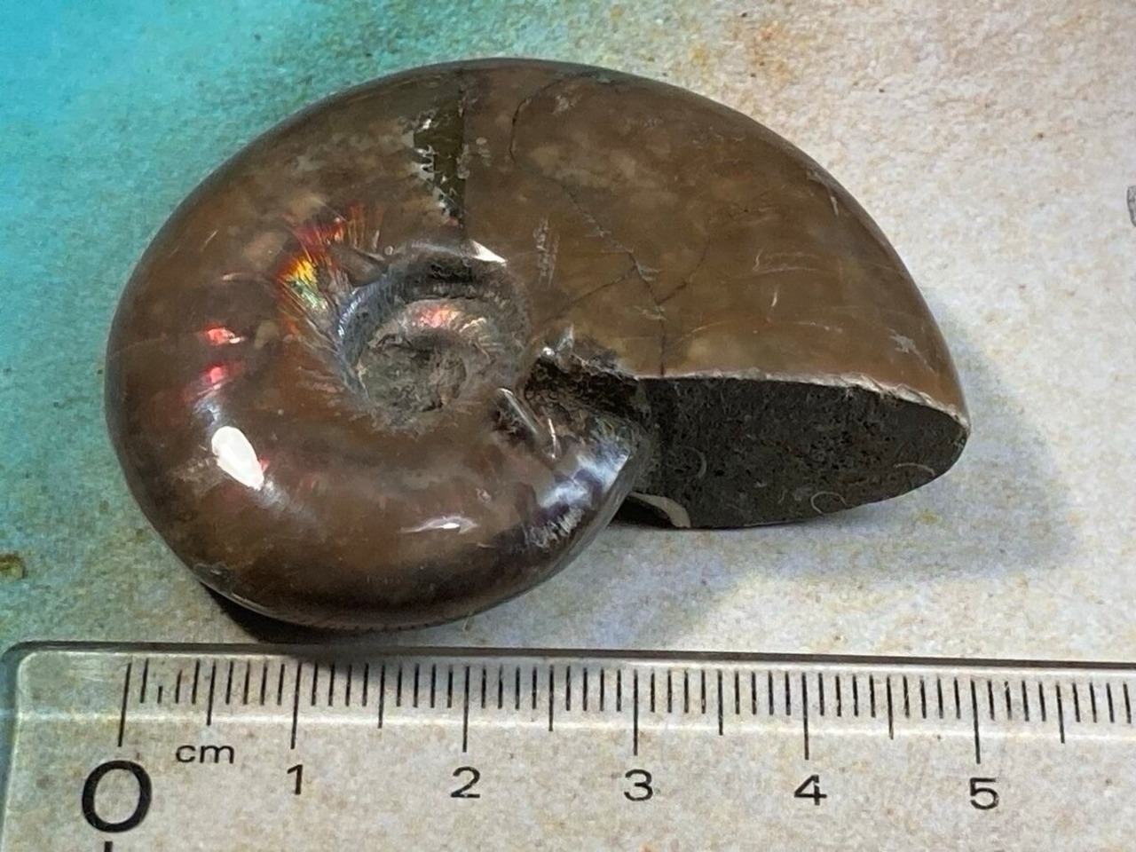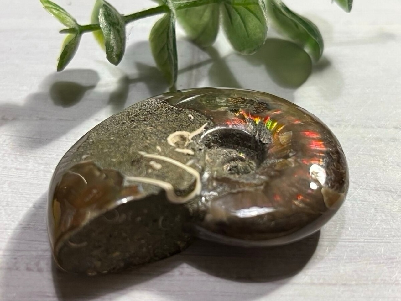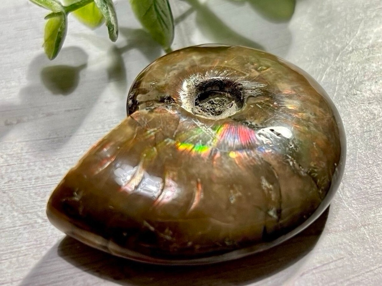 美しい七色の輝きを放つオパール化したアンモナイトの化石(虹入りアンモライト)です✨