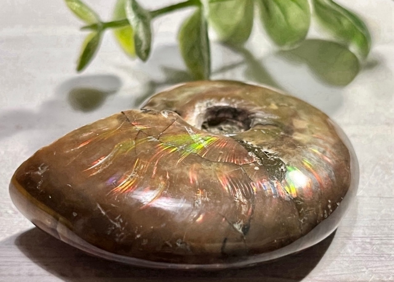 こちらのアンモライトはアンモナイトの化石が7000万年の時を経て作り出された、表面にアラゴナイトが付着して遊色効果を発する化石宝石です。