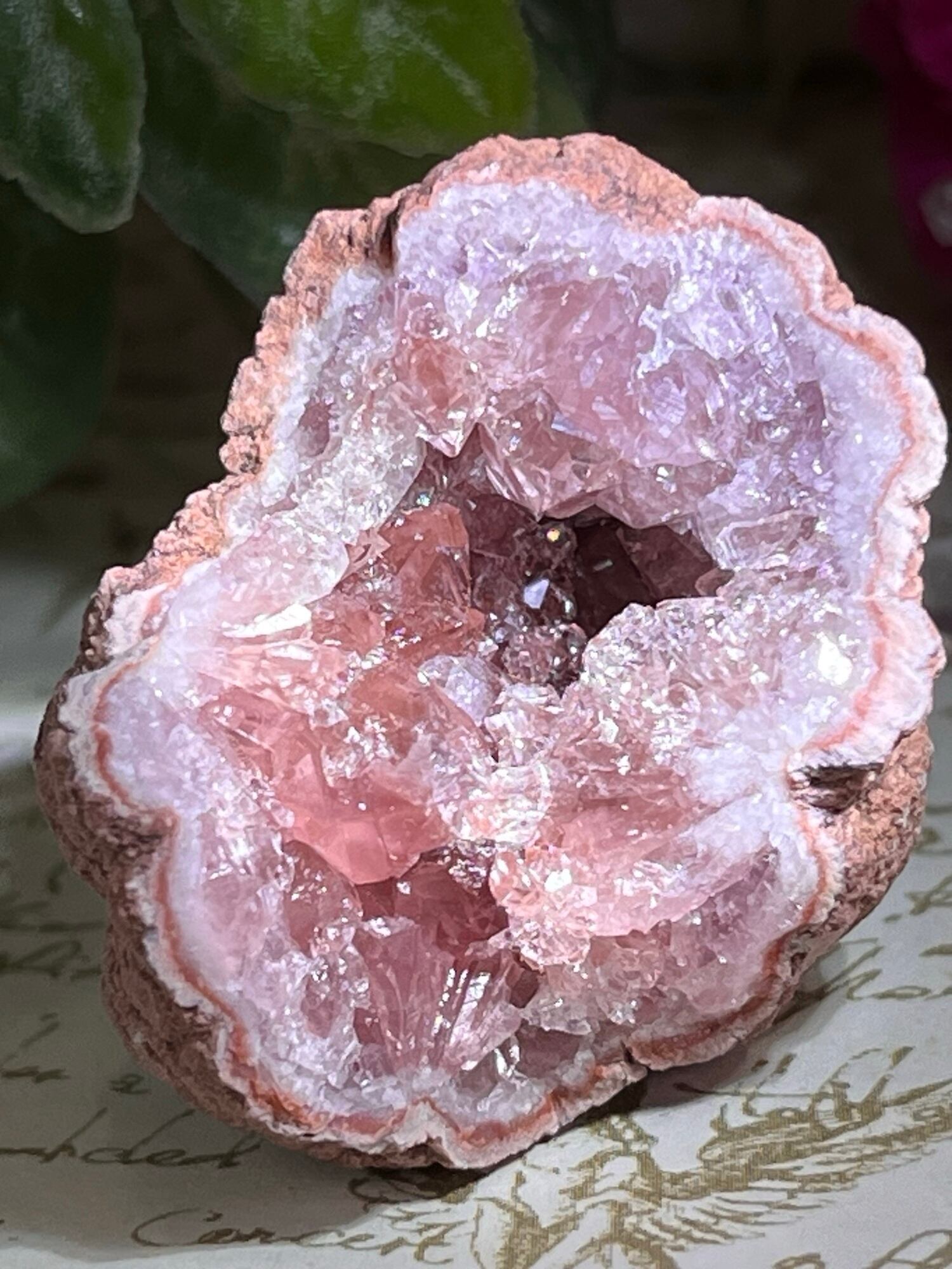 細かな結晶がキラキラと輝くピンクアメジストのジオードです✨