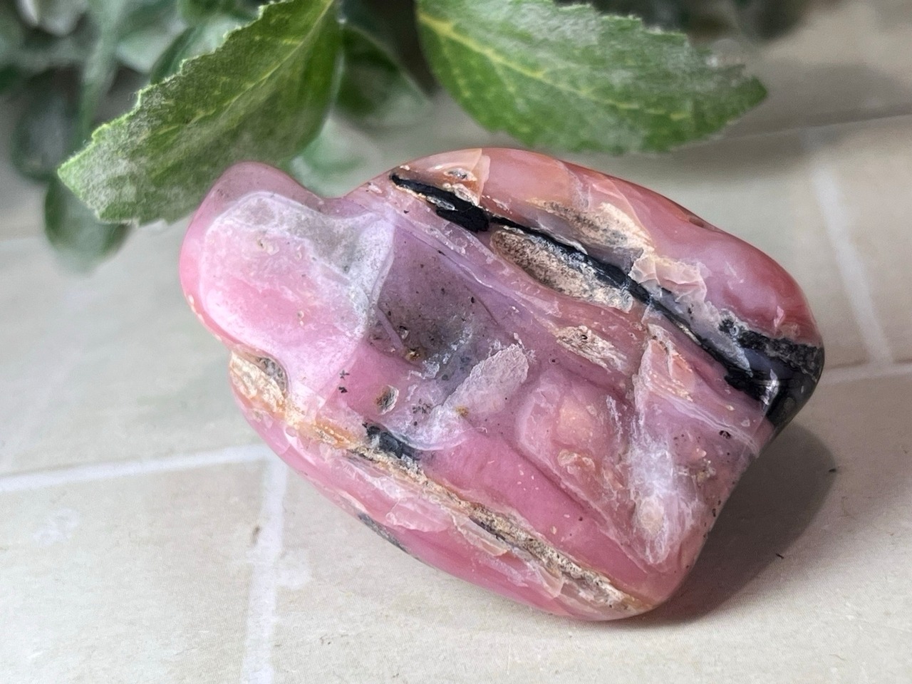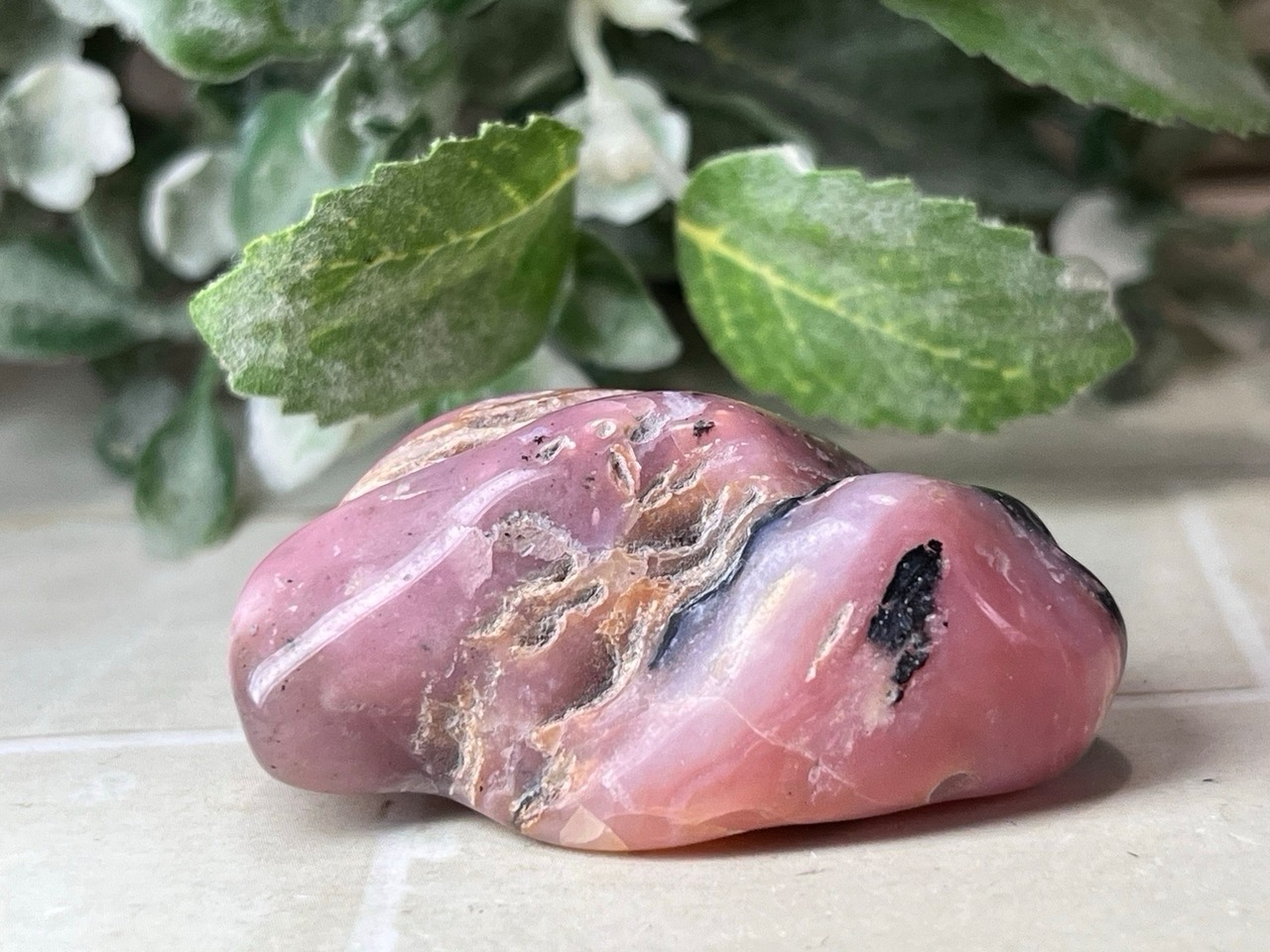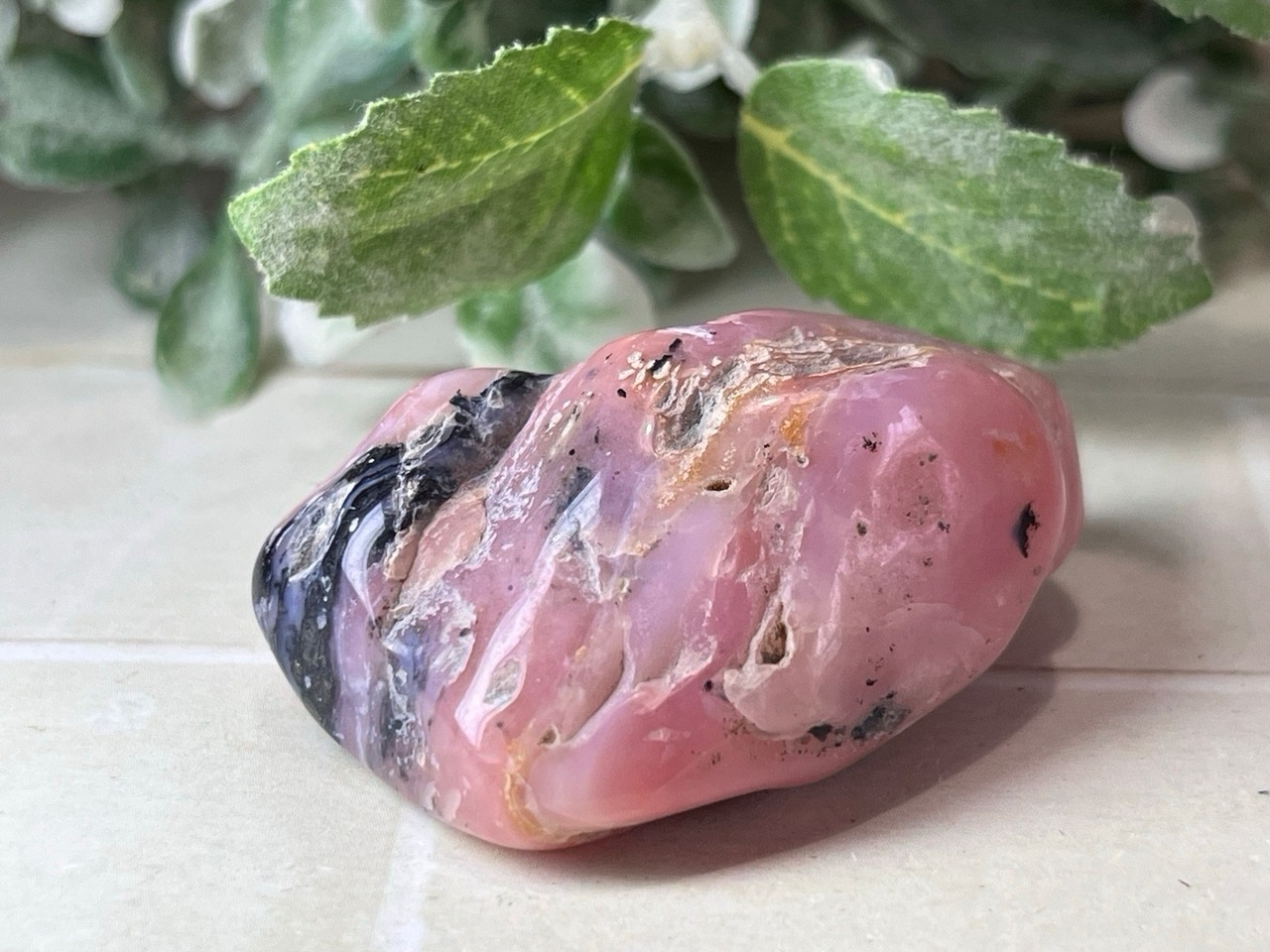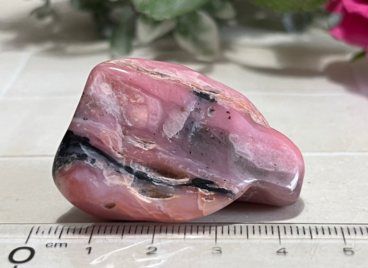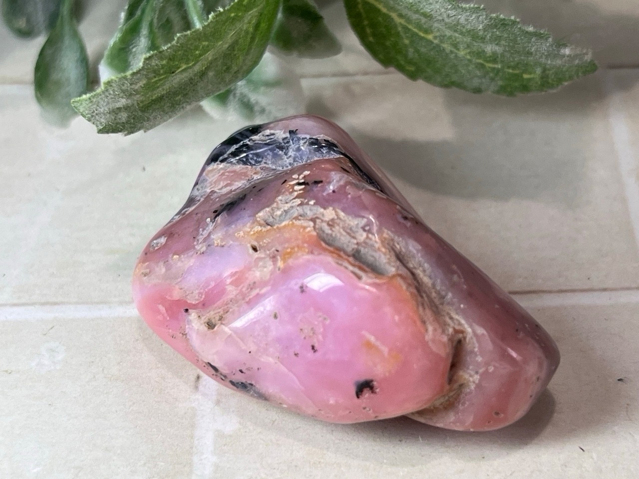 「永遠の命」が石言葉のデンドライト(忍石:茶色の部分)が付いた、ちょっと珍しいデンドリックピンクオパールのタンブルです✨
