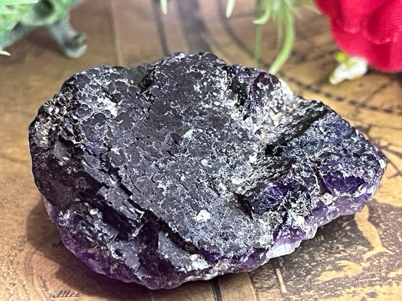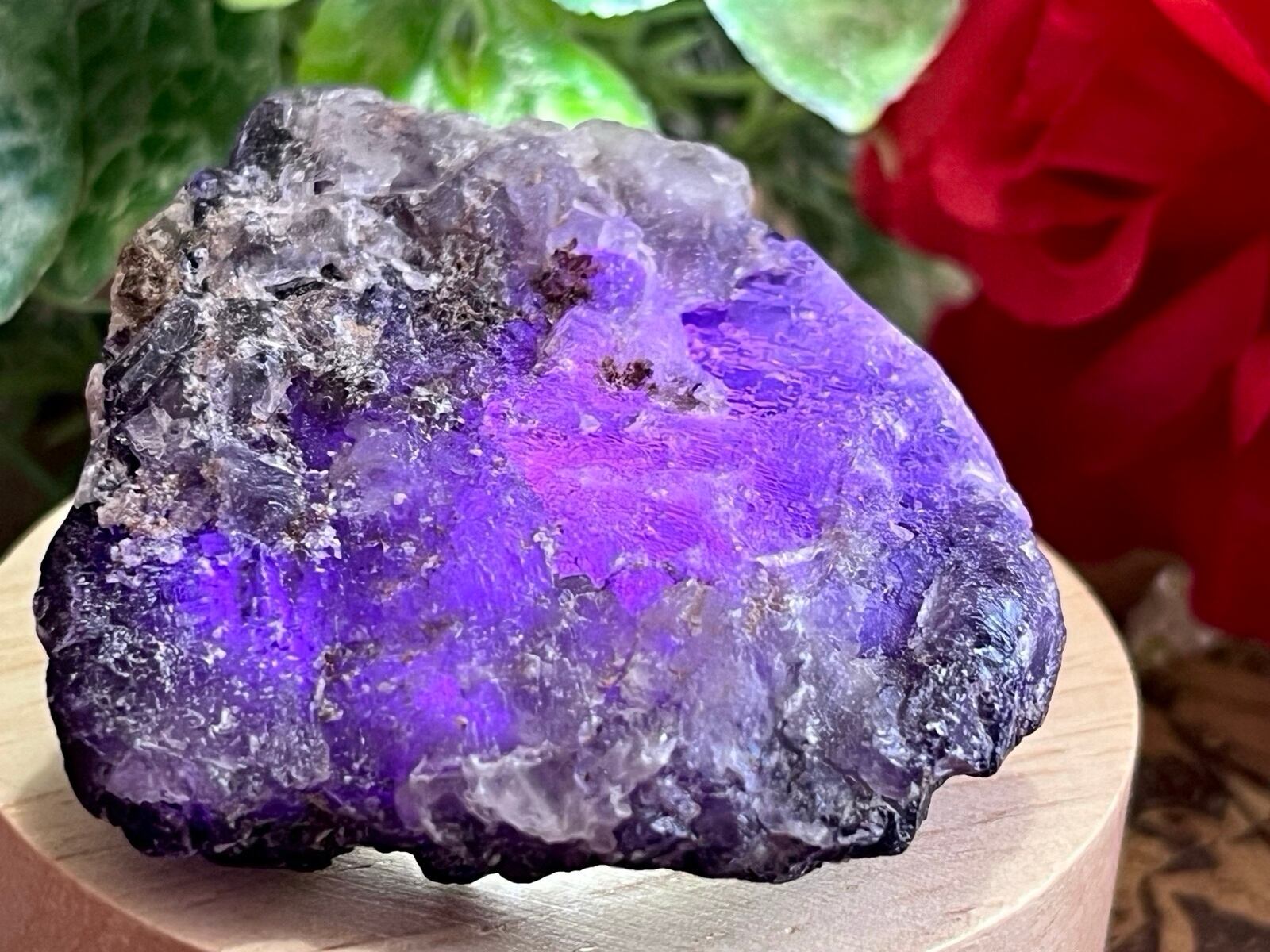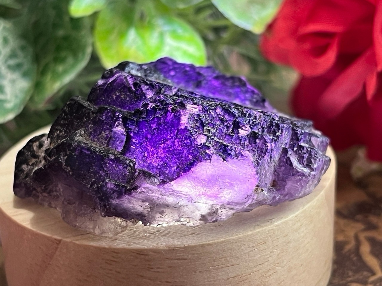 自然光の下だと暗めな色味ですが強いライトで透過させるとビックリするぐらい鮮やかな風合いに変化するパープルフローライトのラフストーンです❁⃘*.゜