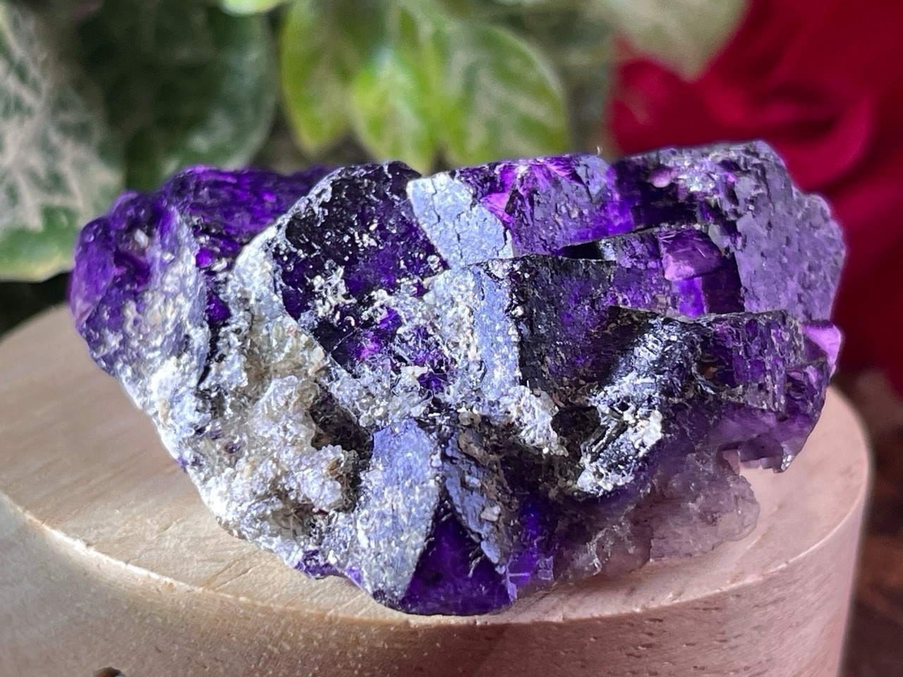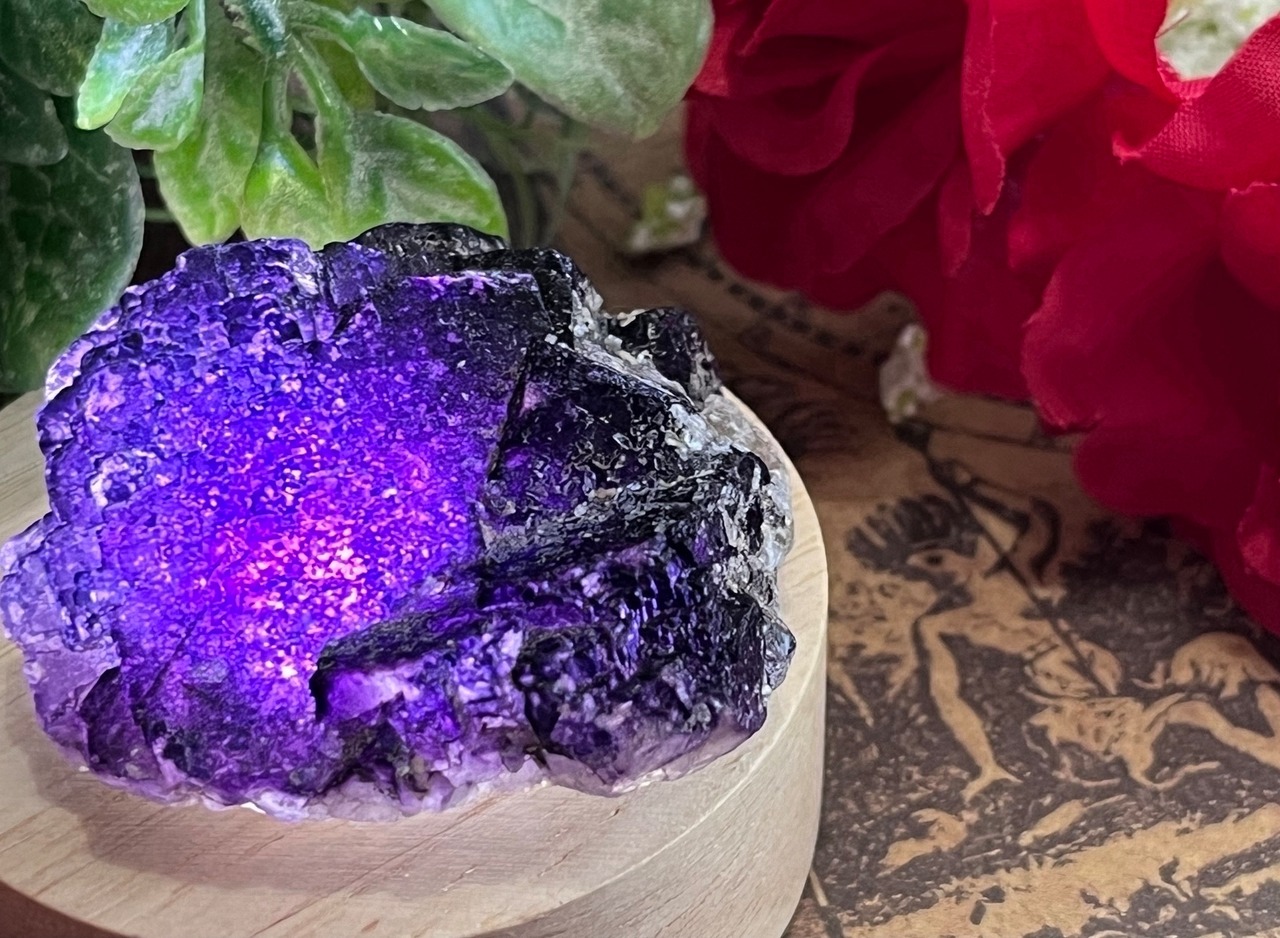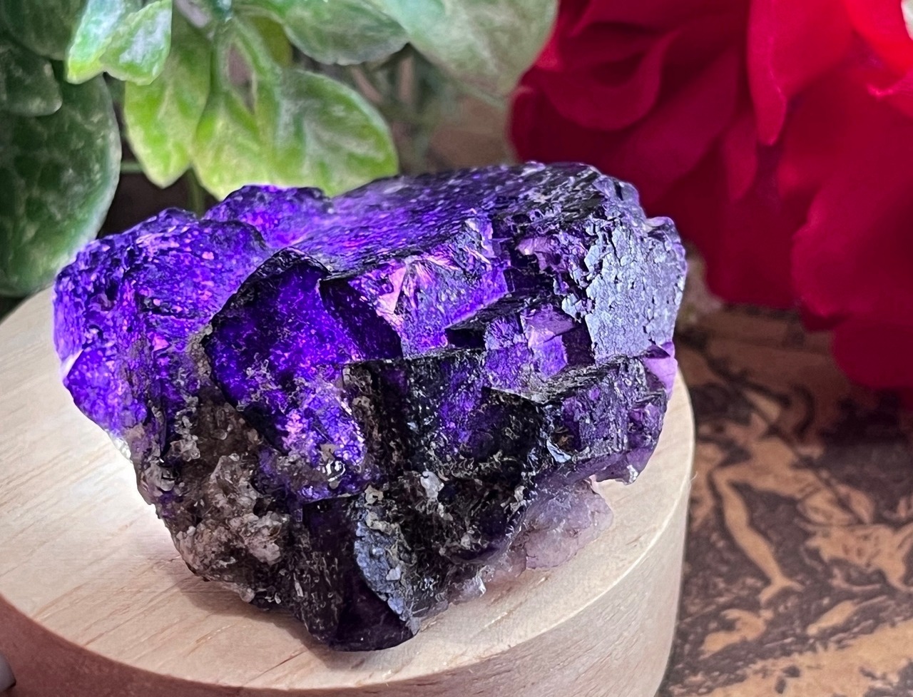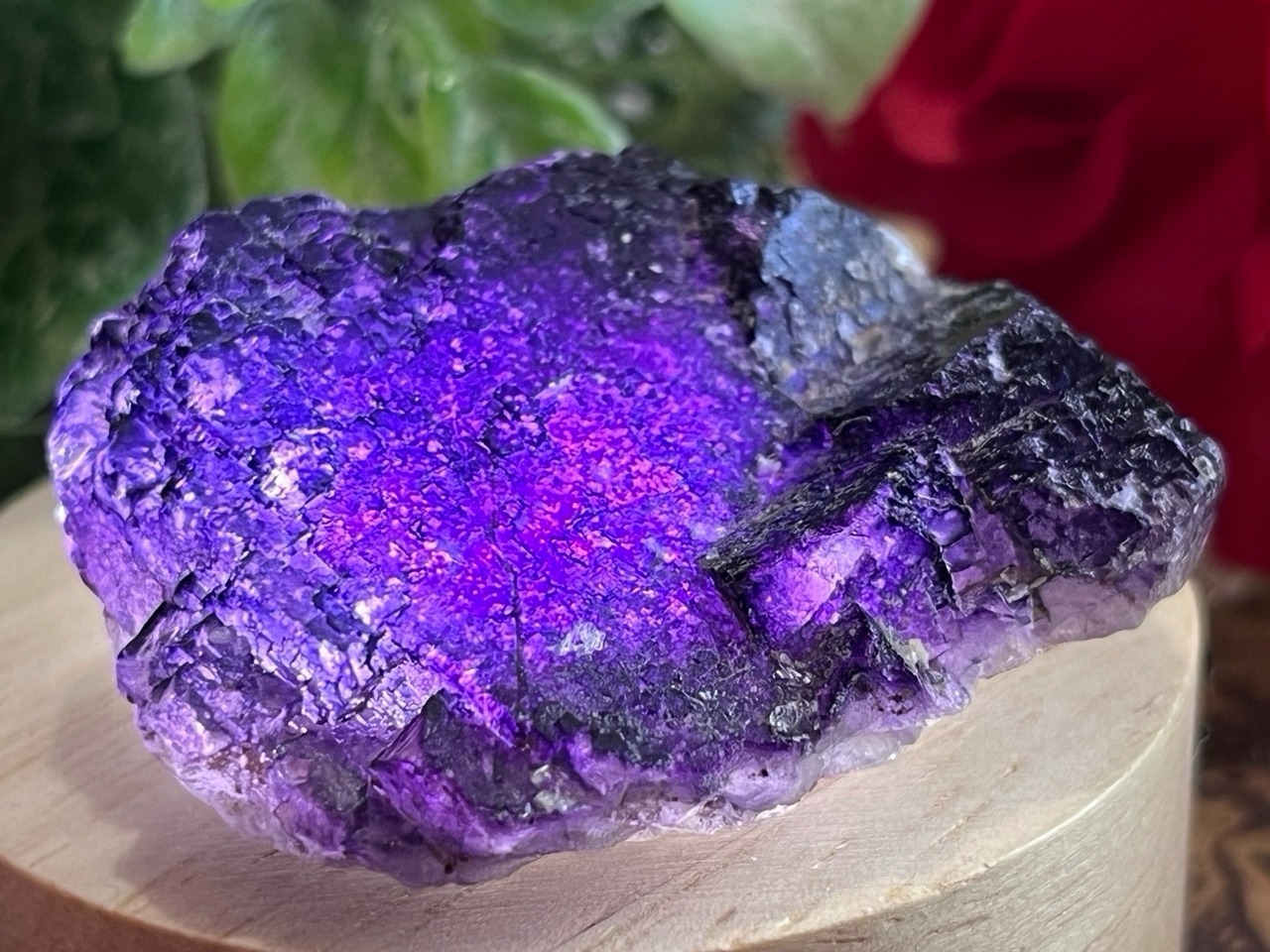 自然光の下だと暗めな色味ですが強いライトで透過させるとビックリするぐらい鮮やかな風合いに変化するパープルフローライトのラフストーンです❁⃘*.゜