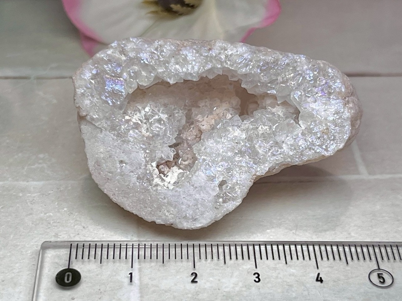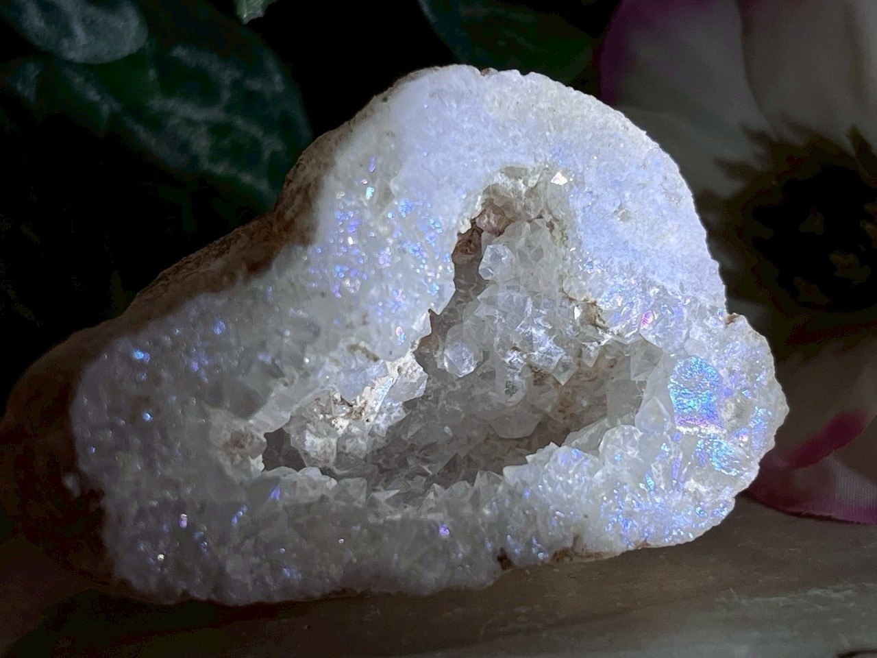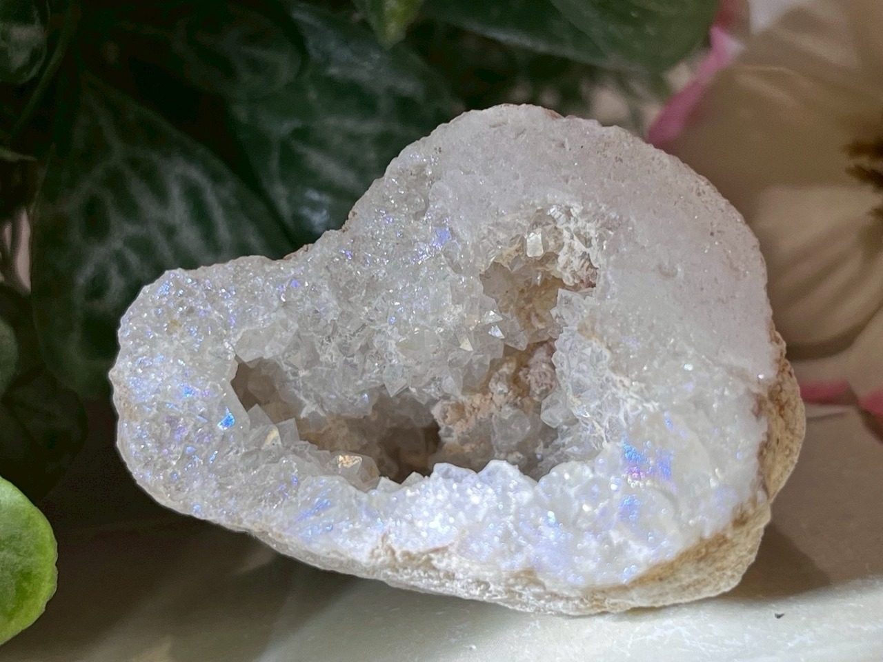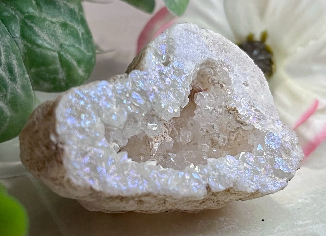 オーロラのような虹色をまとったホワイトのオーラ水晶ジオードです- ̗̀꒰ঌ໒꒱ ̖́-