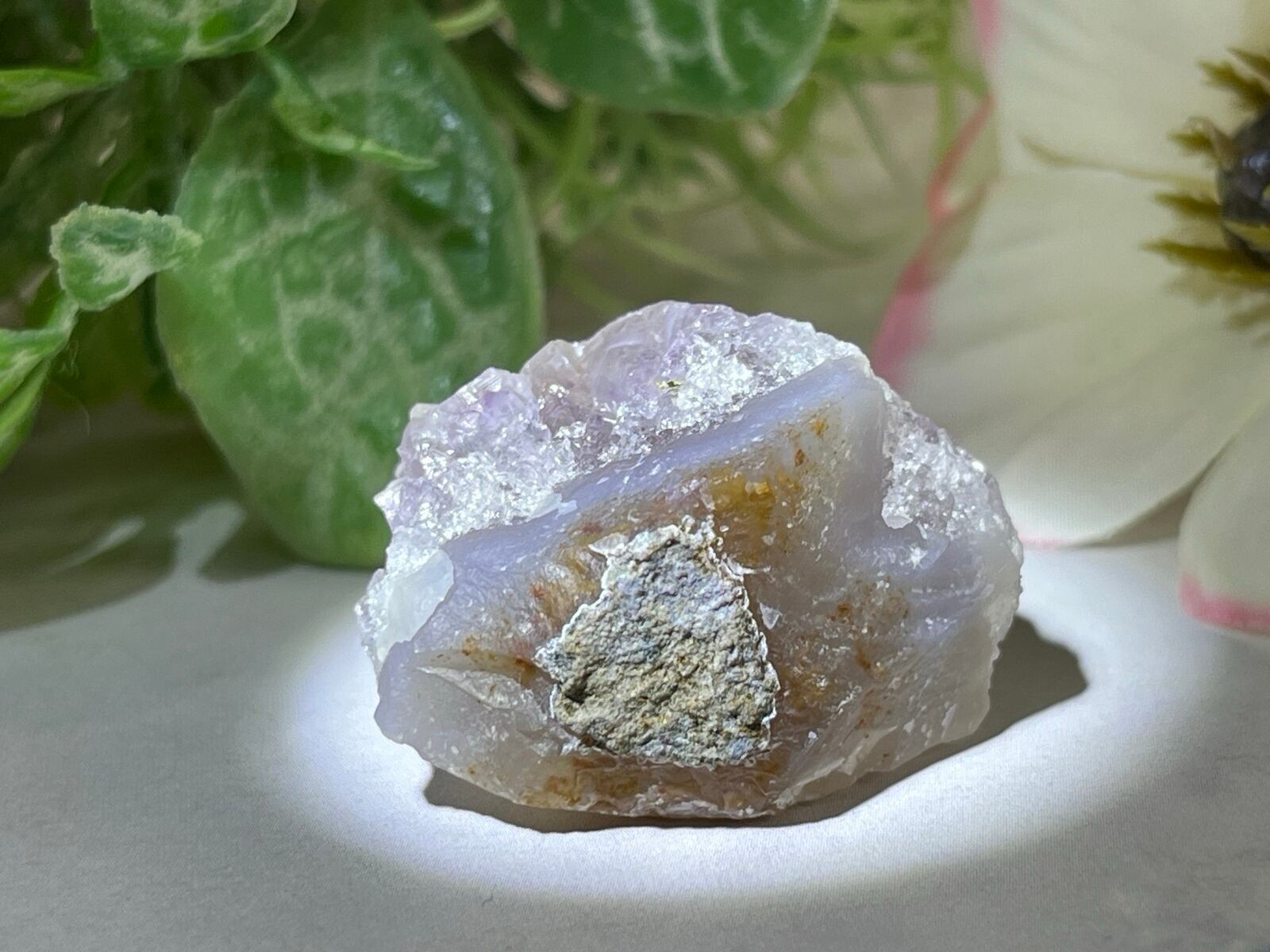 こちらは母岩が瑪瑙質で、透明で細かい氷のような部分はカルサイトが共生しています✨