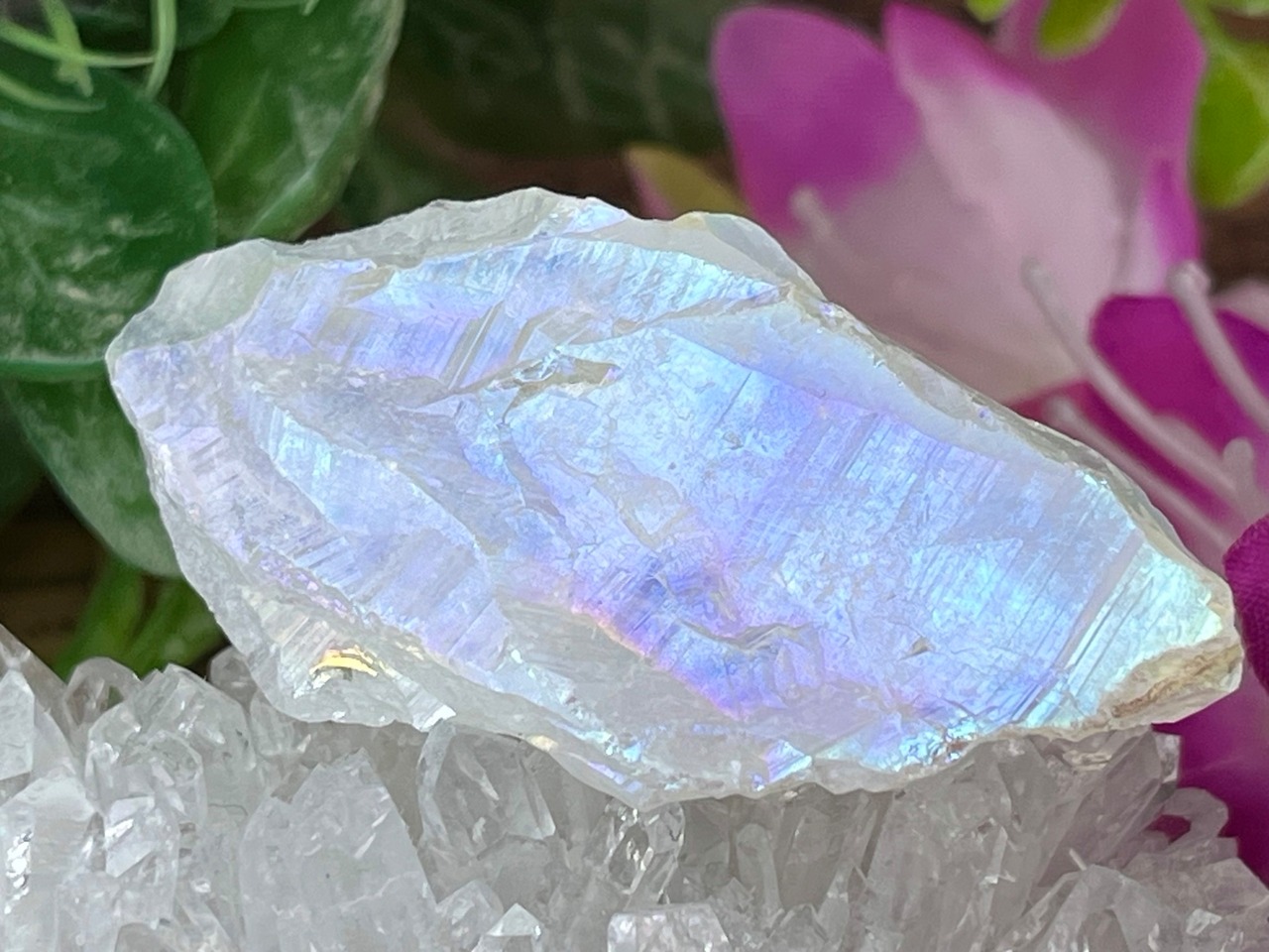 天然の水晶にイオン化した金属の蒸気を添加(蒸着)させた人工物になりますが、自然の物同士を錬金術的な組み合わせという事で、本来の水晶のパワーに上乗せし強化させてあると思われているようで、海外のヒーラーに好まれている石でもあります。
