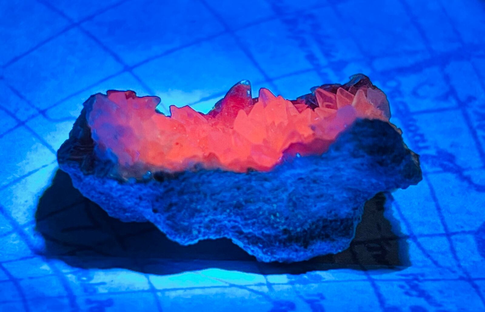 ブラックライトでカルサイトがホワイトからスカーレットに変化する瞬間は圧巻です。