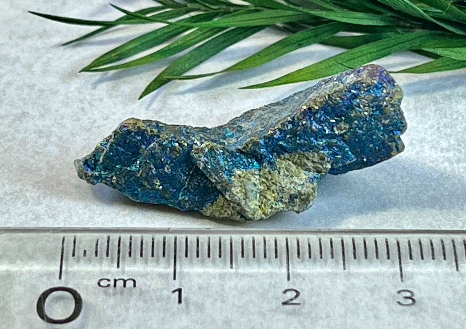 こちらはブルーがベースの天然キャルコパライト(黄銅鉱)で珍しくピーコックオアのような鮮やかな発色があります。