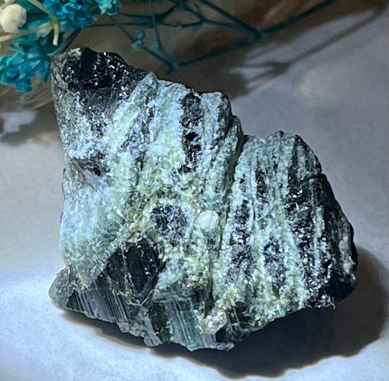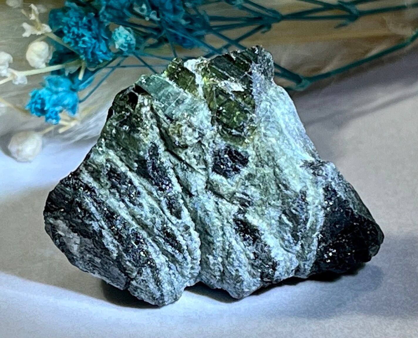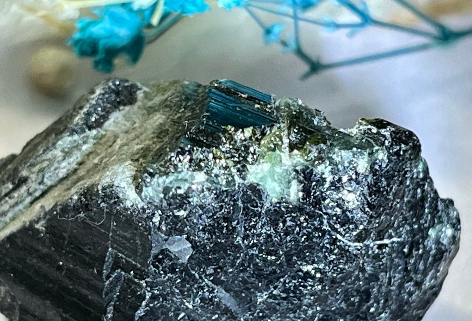 グリーントルマリンとブラックトルマリンがミックスされた珍しい原石です。