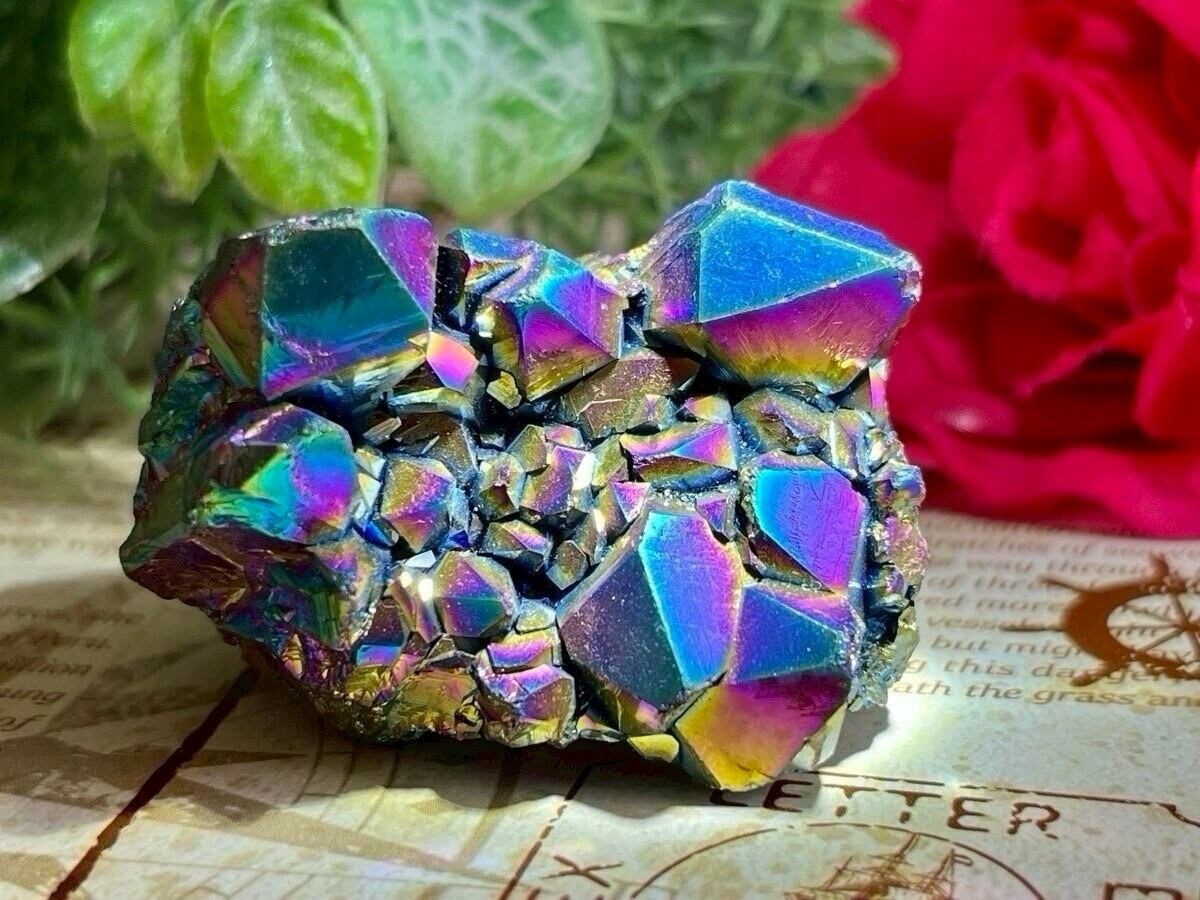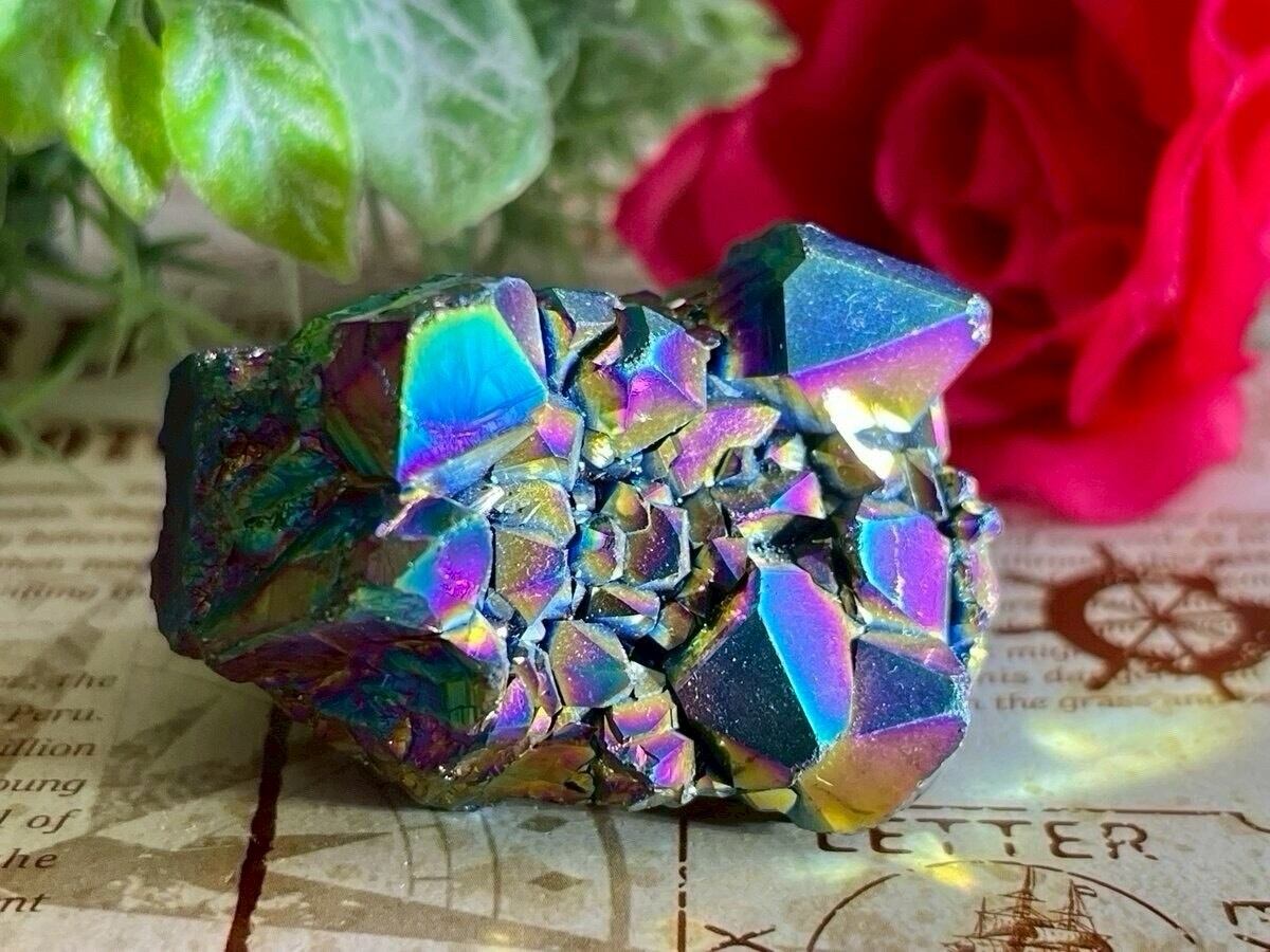 天然の水晶にイオン化した金属の蒸気を添加(蒸着)させた人工物になりますが、自然の物同士を錬金術的な組み合わせという事で、本来の水晶のパワーに上乗せし強化させてあると思われているようで、海外のヒーラーに好まれている石でもあります。