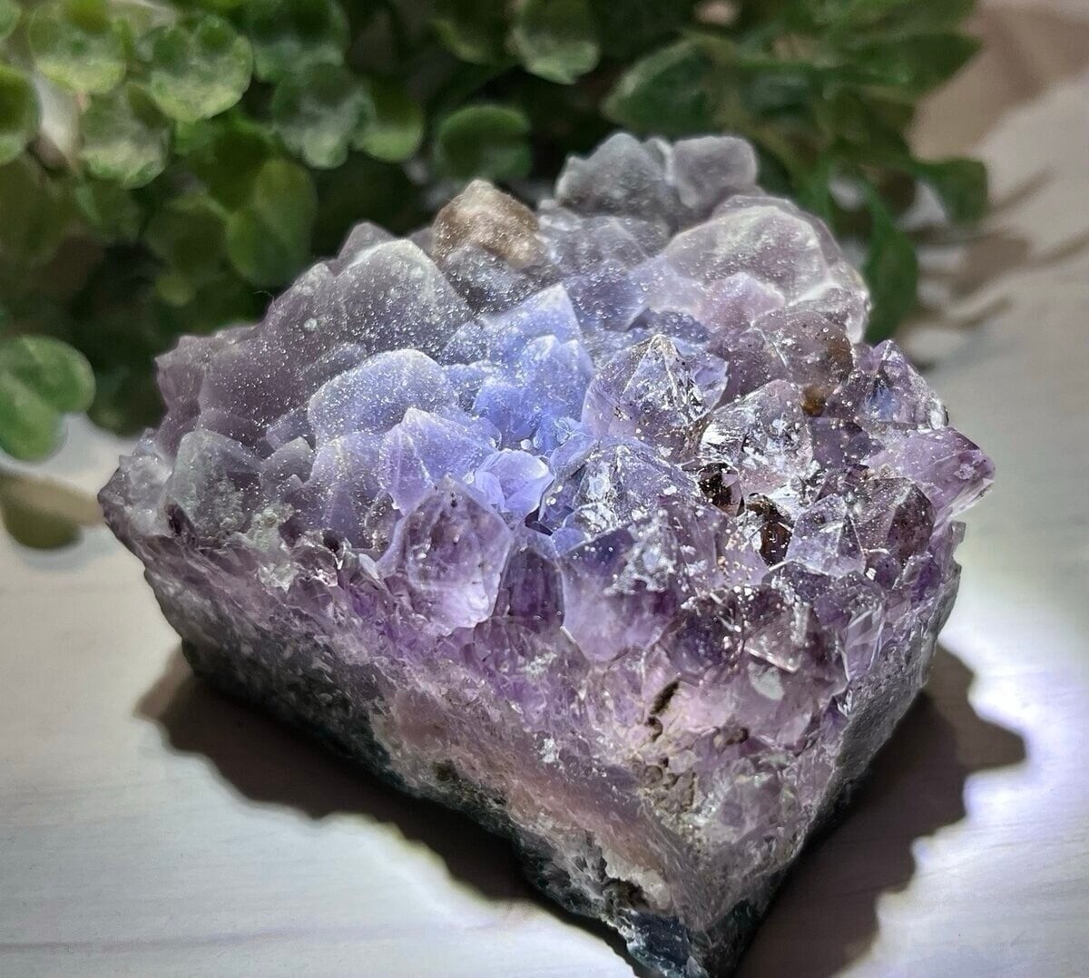 クラスターの半分がとろけるようなカルサイトがかぶさっており、美しいドゥルジーが楽しめるアメジストのクラスターです✨