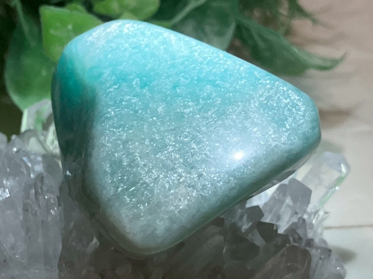 アマゾナイトは「沈静」の波動を持ち、わだかまりをとかして、表現力やコミュニケーションを高めると伝えられています。そのため、仕事や友人関係において良い影響を与えてくれるでしょう。